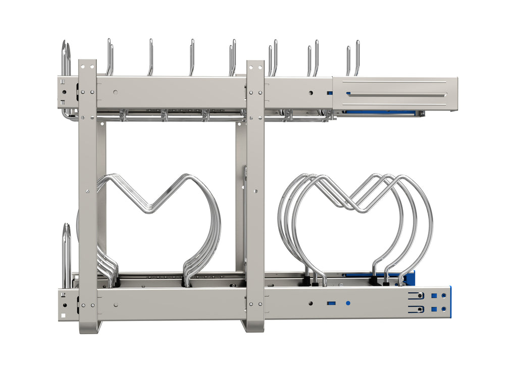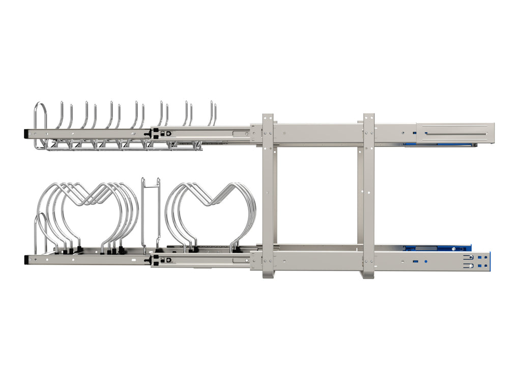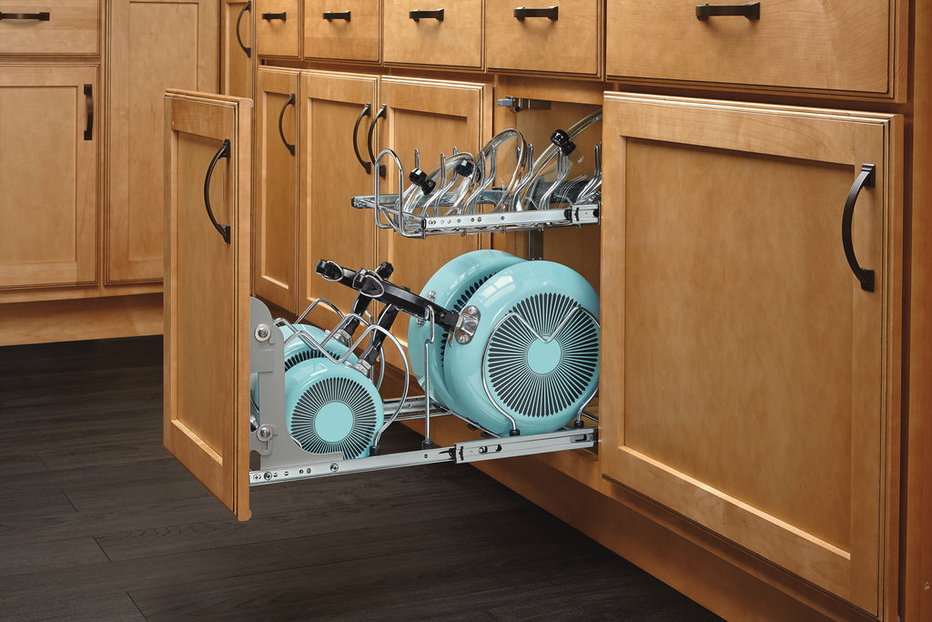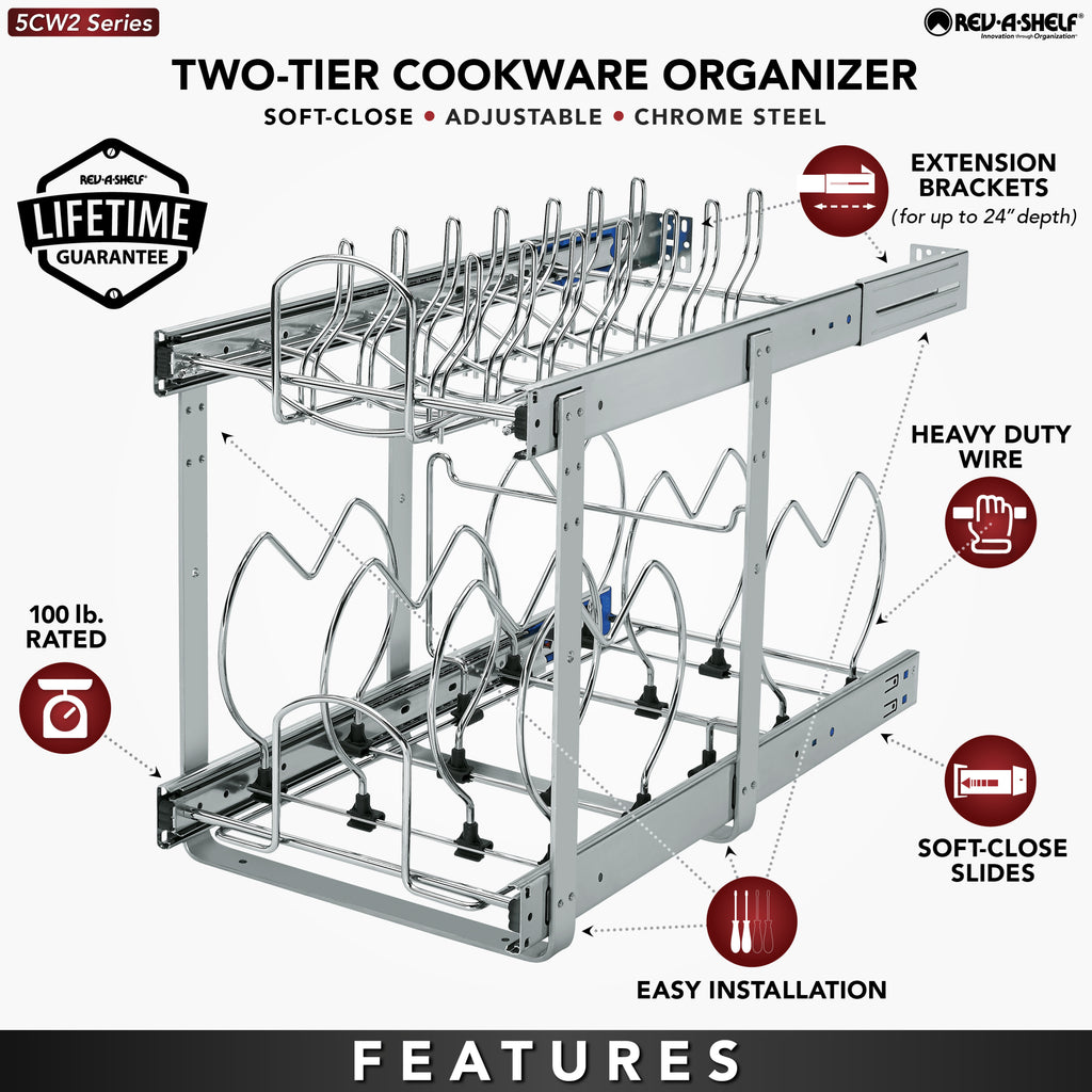 Revolutionize the way you store your pots, pans, and lids with the Rev-A-Shelf® Two-Tier Cookware Organizer. The 5CW2 features independently operating shelves that accommodate a variety of cookware sizes and brands. The top tier organizes lids and the bottom tier features adjustable dividers to store a variety of larger pots and pans. Made with a heavy-duty chrome-plated wire frame and 100 lb. rated full-extension ball-bearing slides. The bottom, side, and rear mounting provide you the sturdiness you expect and easy installation. Optional door-mounting kit available with the 5WB-DMKIT.. Included: (1) Chrome Two-Tier cookware organizer, dividers and mounting hardware