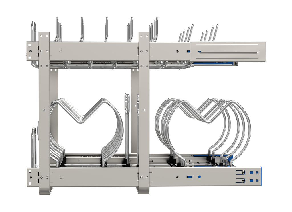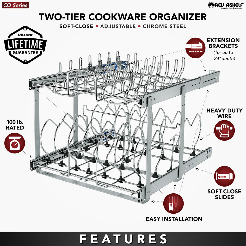 Revolutionize the way you store your pots, pans, and lids with the Rev-A-Shelf® Two-Tier Cookware Organizer. The 5CW2 features independently operating shelves that accommodate a variety of cookware sizes and brands. The top tier organizes lids and the bottom tier features adjustable dividers to store a variety of larger pots and pans. Made with a heavy-duty chrome-plated wire frame and 100 lb. rated full-extension ball-bearing slides. The bottom, side, and rear mounting provide you the sturdiness you expect and easy installation. Optional door-mounting kit available with the 5WB-DMKIT.. Included: (1) Chrome Two-Tier cookware organizer, dividers and mounting hardware