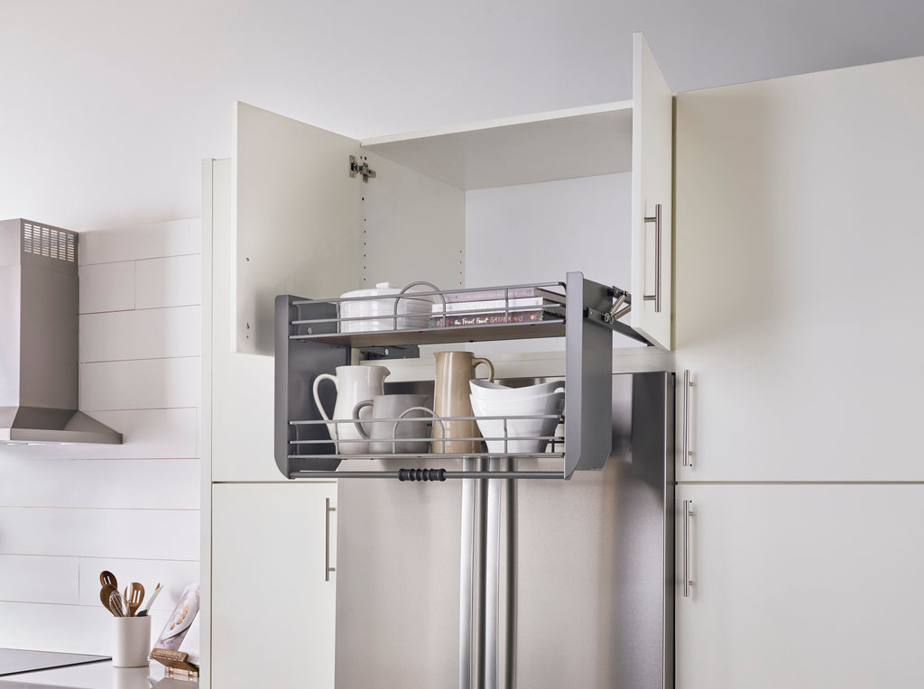 - Brings items down 11-1/2" and 16-3/4" out of the cabinet with gas-assisted pistons