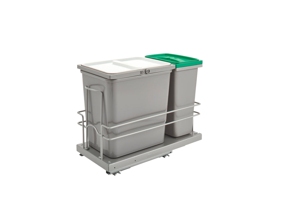 With a reduced depth and height, the 5SB Series pullout is the universal answer to your waste needs. Ideal for under sink kitchen and vanity cabinetry, the 5SB glides on soft-close slides and includes a 15 L bin with a white lid for trash, and a 8 L bin with a green lid for recyclables. Both bins feature built-in handles for easy removal.. Included: (1) Frame, Slide set, (1) 15L Bin, (1) 8L Bin