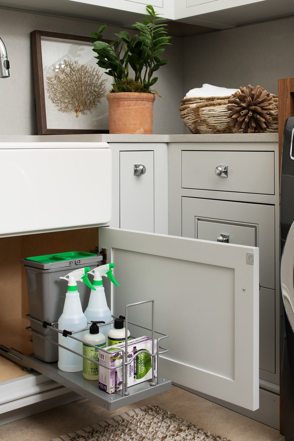 Small in size but large in functionality. That is exactly what you get with the Rev-A-Shelf® Universal Waste and Cleaning Pullout. The reduced depth and height makes the 5SB Series ideal for full access (frameless) under sink.. Included: (1) Frame, Slide set, (1) 8L Bin, (2) Spray bottles