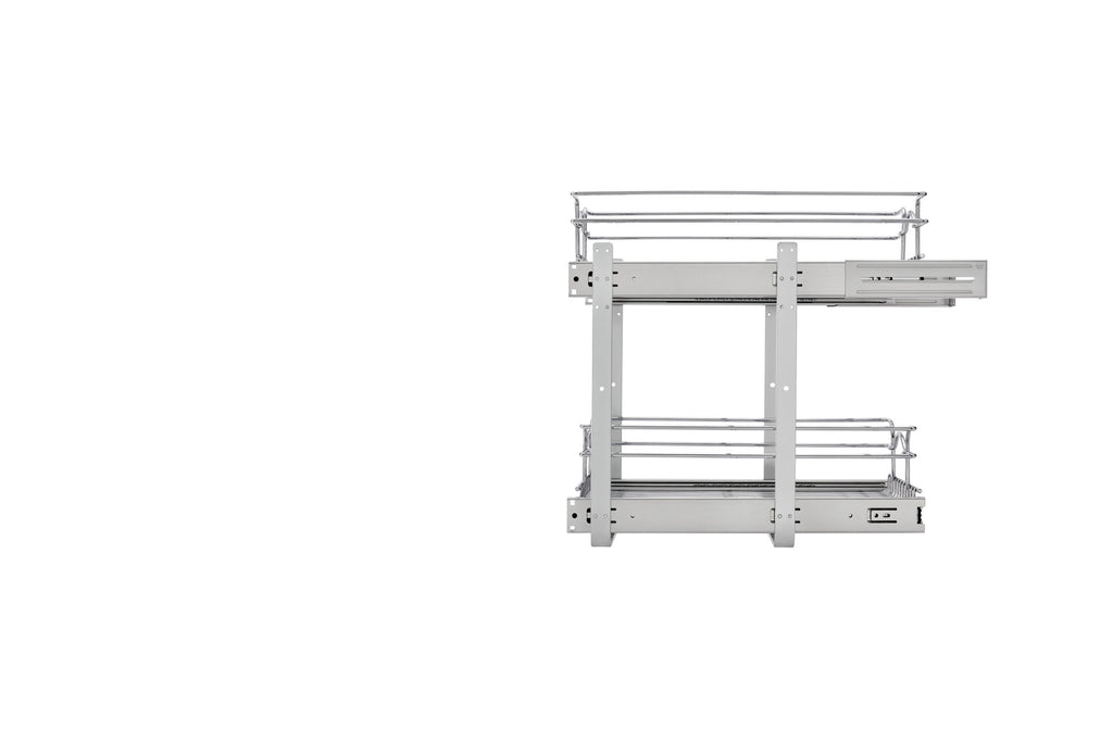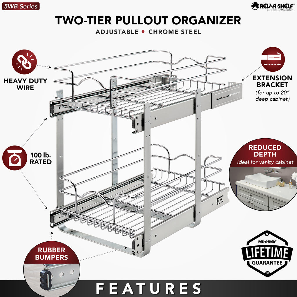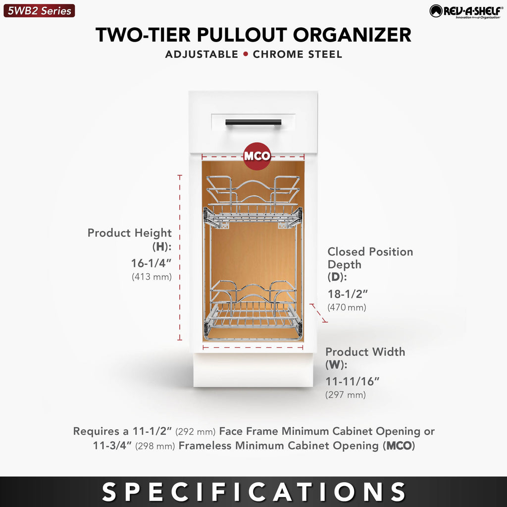The redesigned Rev-A-Shelf® Two-Tier Baskets make other 2-shelf units fail in comparison. With the heavy-gauge construction, ball-bearing slides on both baskets and multiple mounting points, this is the best two-tier unit available. With 100lb slides on each basket you don't have to worry about overloading or bending. Multiple sized width and depths are available, so you are sure to find the exact unit that fits your exact cabinet size. Optimize the performance, by adding the optional door mount kit to add a truly one-step opening/closing process (sold separately - 5WB-DMKIT).. Included: (1) Top basket, (1) bottom basket, (2) u-shape supports, (2) rear mounting brackets and hardware