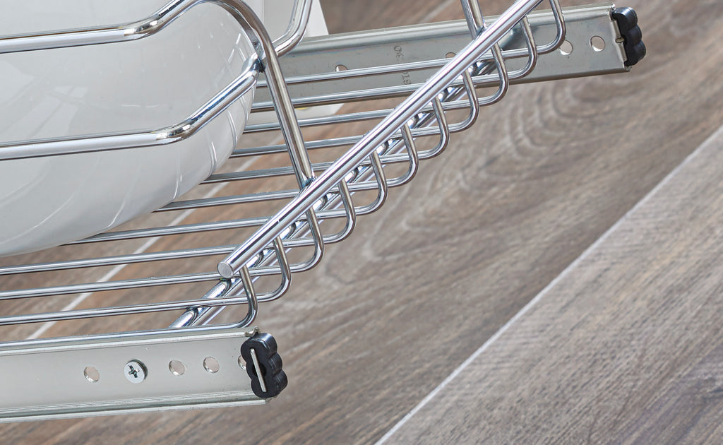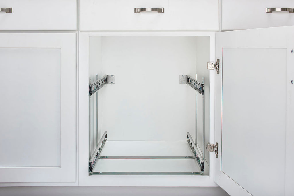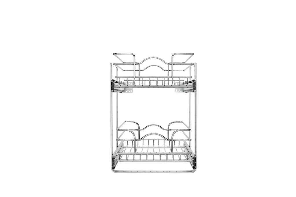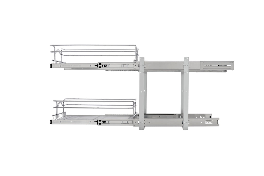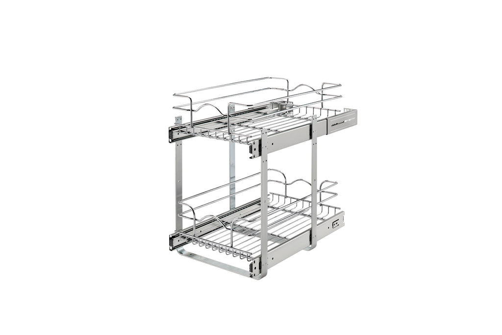 The redesigned Rev-A-Shelf® Two-Tier Baskets make other 2-shelf units fail in comparison. With the heavy-gauge construction, ball-bearing slides on both baskets and multiple mounting points, this is the best two-tier unit available. With 100lb slides on each basket you don't have to worry about overloading or bending. Multiple sized width and depths are available, so you are sure to find the exact unit that fits your exact cabinet size. Optimize the performance, by adding the optional door mount kit to add a truly one-step opening/closing process (sold separately - 5WB-DMKIT).. Included: (1) Top basket, (1) bottom basket, (2) u-shape supports, (2) rear mounting brackets and hardware