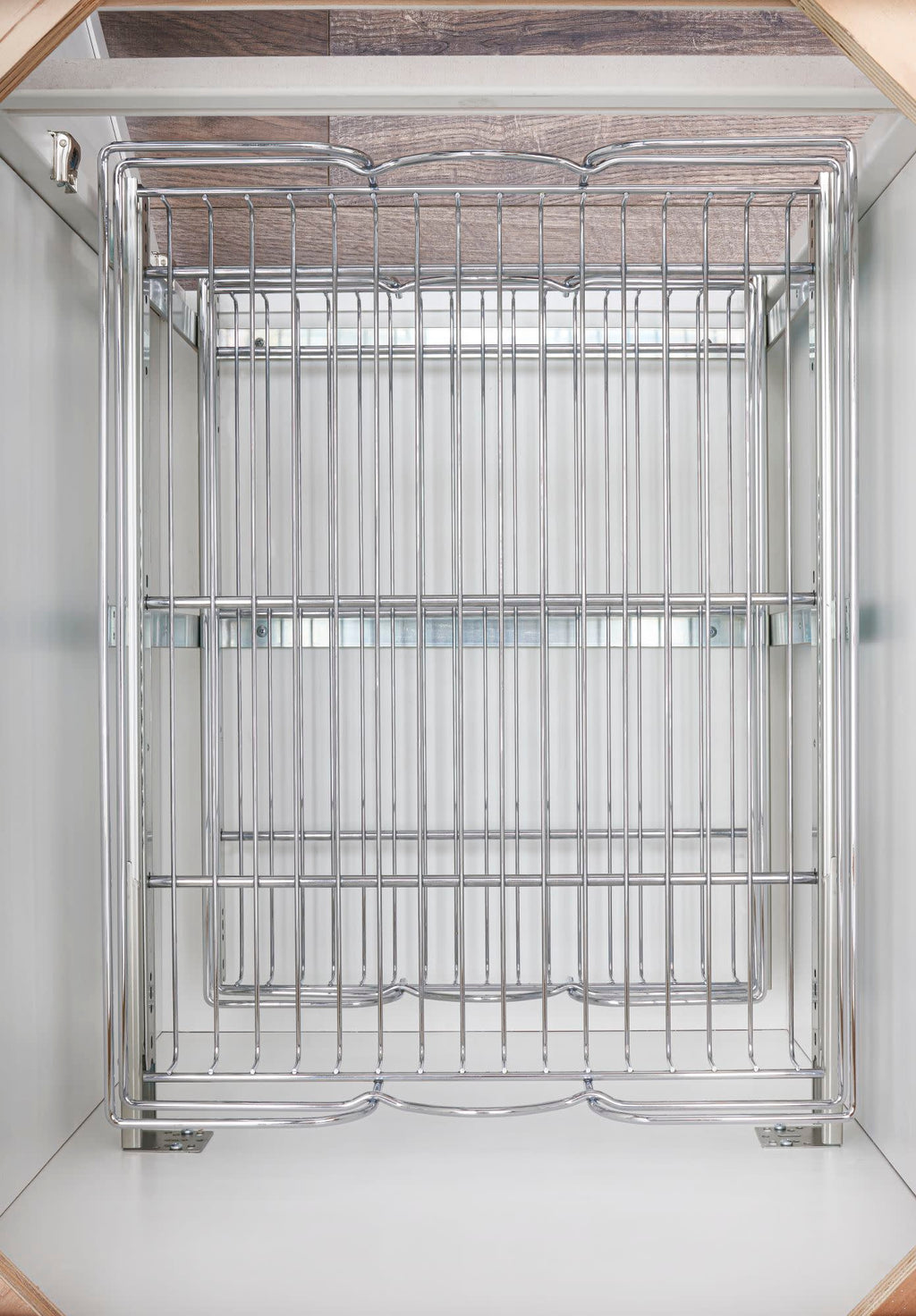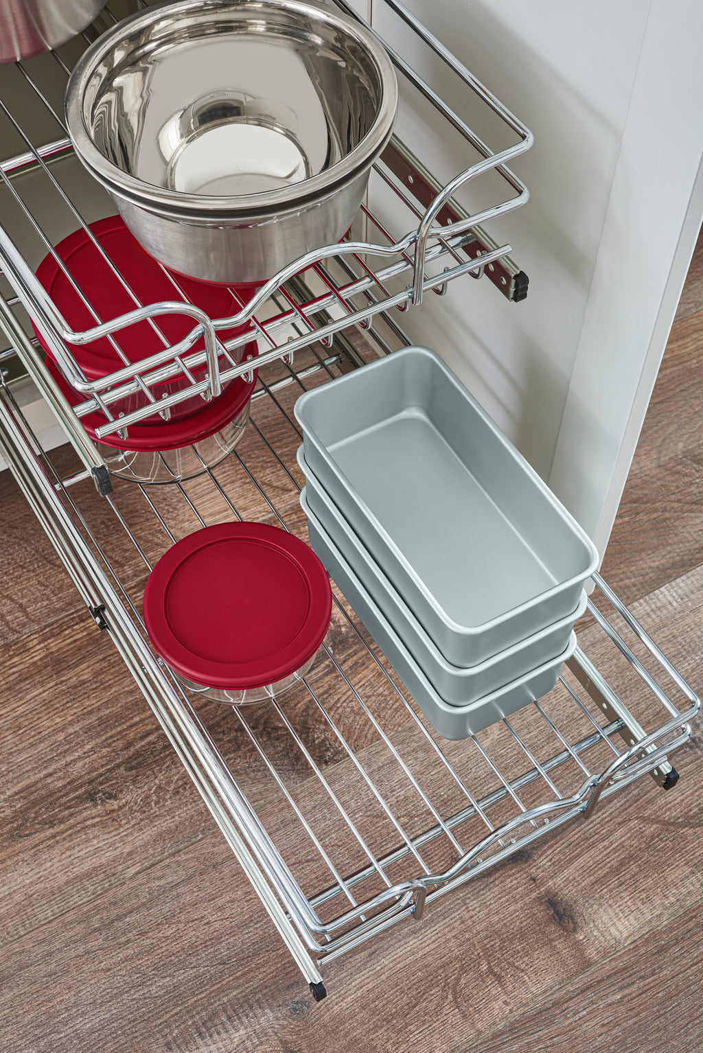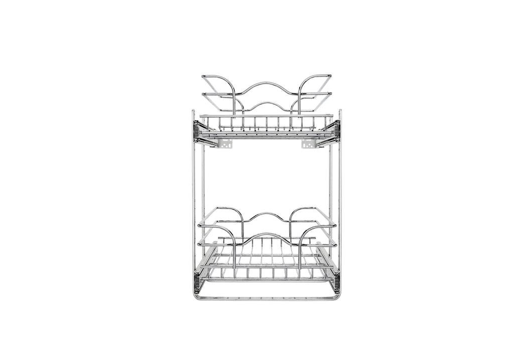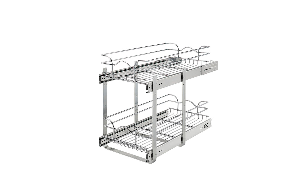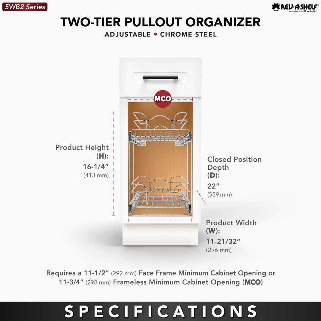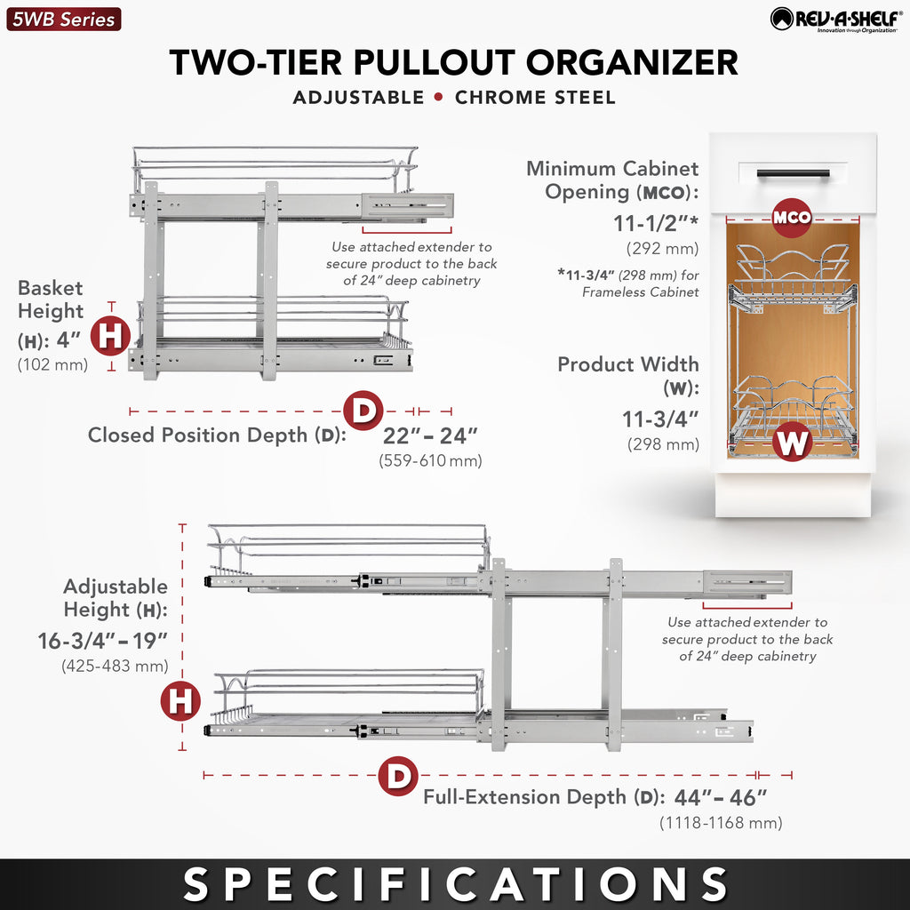 The redesigned Rev-A-Shelf® Two-Tier Baskets make other 2-shelf units fail in comparison. With the heavy-gauge construction, ball-bearing slides on both baskets and multiple mounting points, this is the best two-tier unit available. With 100lb slides on each basket you don't have to worry about overloading or bending. Multiple sized width and depths are available, so you are sure to find the exact unit that fits your exact cabinet size. Optimize the performance, by adding the optional door mount kit to add a truly one-step opening/closing process (sold separately - 5WB-DMKIT).. Included: (1) Top basket, (1) bottom basket, (2) u-shape supports, (2) rear mounting brackets and hardware