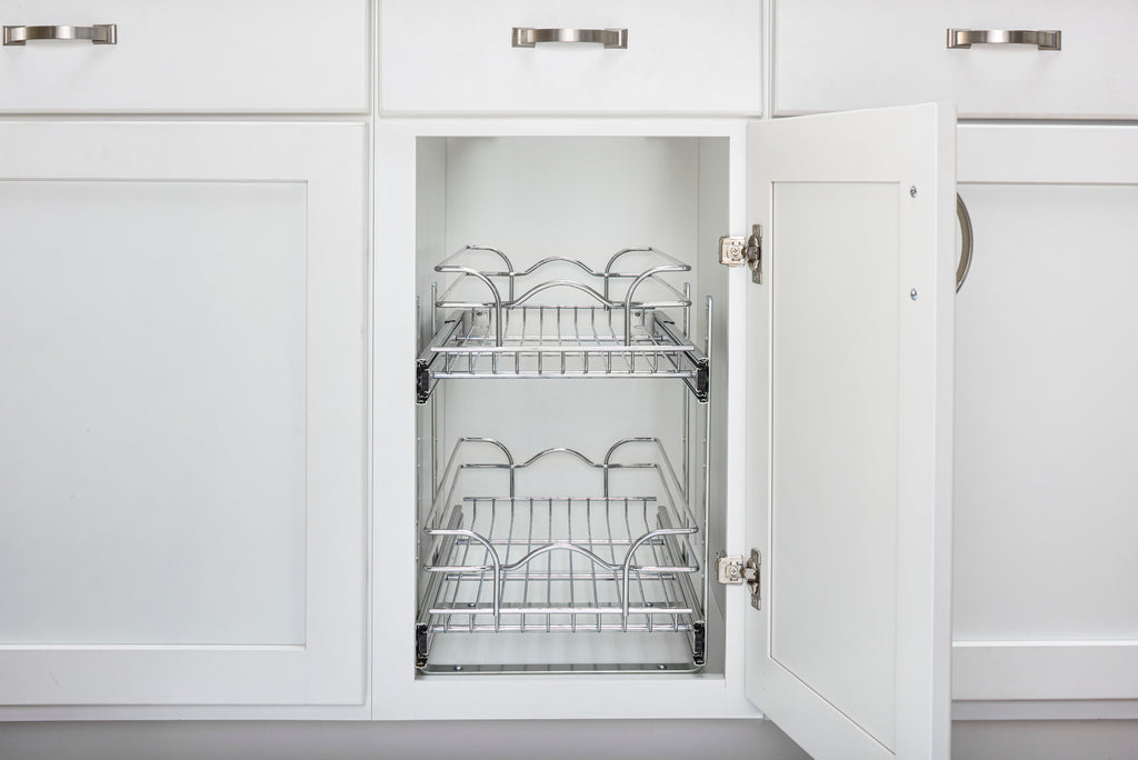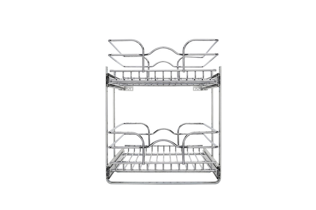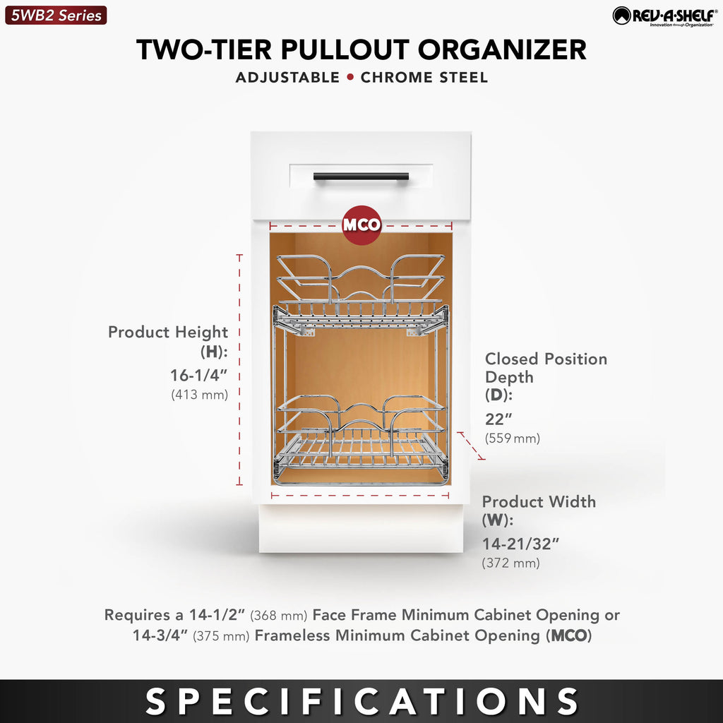 The redesigned Rev-A-Shelf® Two-Tier Baskets make other 2-shelf units fail in comparison. With the heavy-gauge construction, ball-bearing slides on both baskets and multiple mounting points, this is the best two-tier unit available. With 100lb slides on each basket you don't have to worry about overloading or bending. Multiple sized width and depths are available, so you are sure to find the exact unit that fits your exact cabinet size. Optimize the performance, by adding the optional door mount kit to add a truly one-step opening/closing process (sold separately - 5WB-DMKIT).. Included: (1) Top basket, (1) bottom basket, (2) u-shape supports, (2) rear mounting brackets and hardware