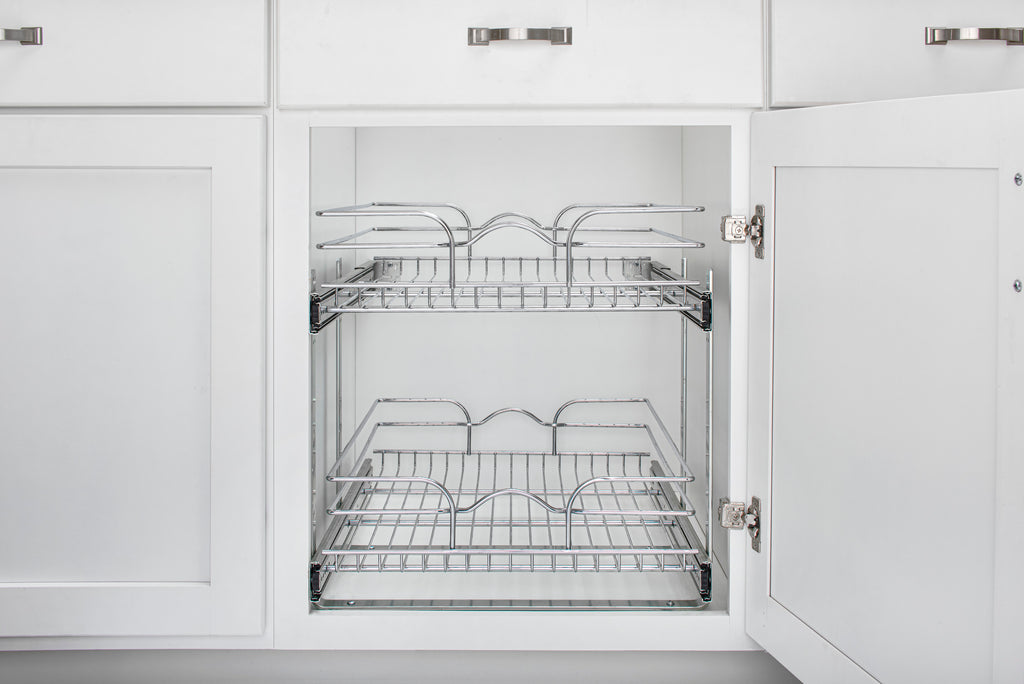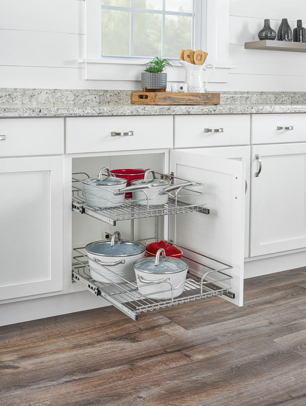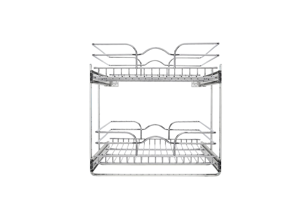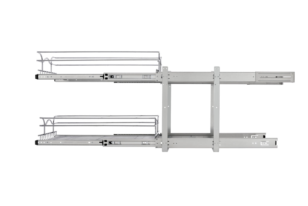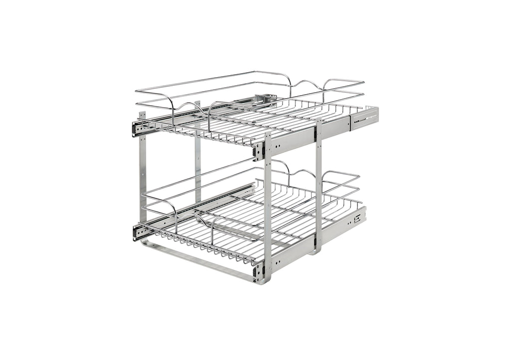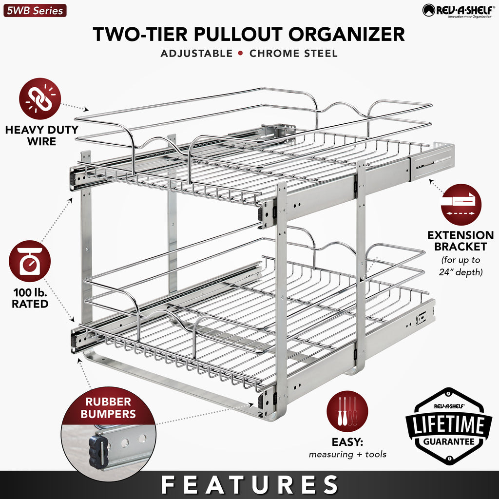 The redesigned Rev-A-Shelf® Two-Tier Baskets make other 2-shelf units fail in comparison. With the heavy-gauge construction, ball-bearing slides on both baskets and multiple mounting points, this is the best two-tier unit available. With 100lb slides on each basket you don't have to worry about overloading or bending. Multiple sized width and depths are available, so you are sure to find the exact unit that fits your exact cabinet size. Optimize the performance, by adding the optional door mount kit to add a truly one-step opening/closing process (sold separately - 5WB-DMKIT).. Included: (1) top basket, (1) bottom basket, (2) u-shape supports, (2) rear mounting brackets and hardware