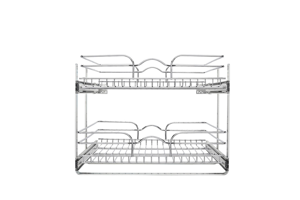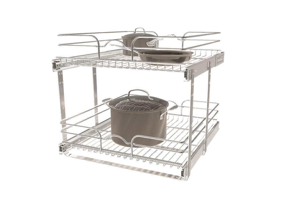 The redesigned Rev-A-Shelf® Two-Tier Baskets make other 2-shelf units fail in comparison. With the heavy-gauge construction, ball-bearing slides on both baskets and multiple mounting points, this is the best two-tier unit available. With 100lb slides on each basket you don't have to worry about overloading or bending. Multiple sized width and depths are available, so you are sure to find the exact unit that fits your exact cabinet size. Optimize the performance, by adding the optional door mount kit to add a truly one-step opening/closing process (sold separately - 5WB-DMKIT).. Included: (1) Top basket, (1) bottom basket, (2) u-shape supports, (2) rear mounting brackets and hardware