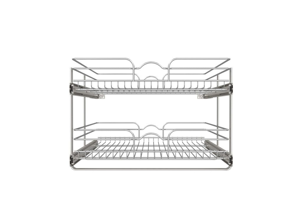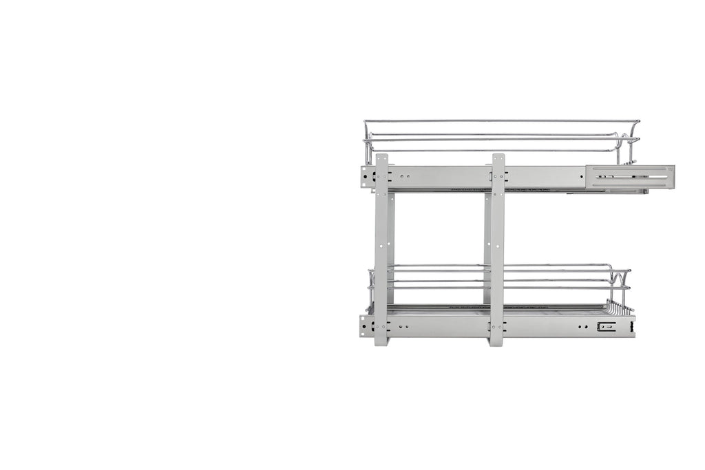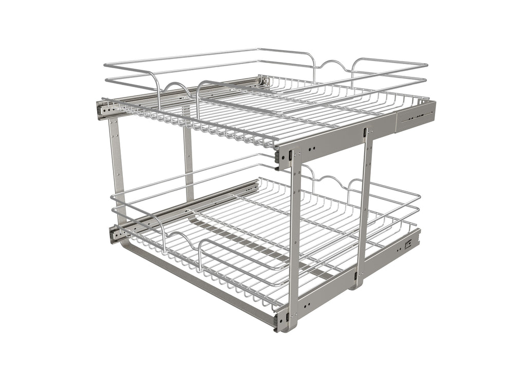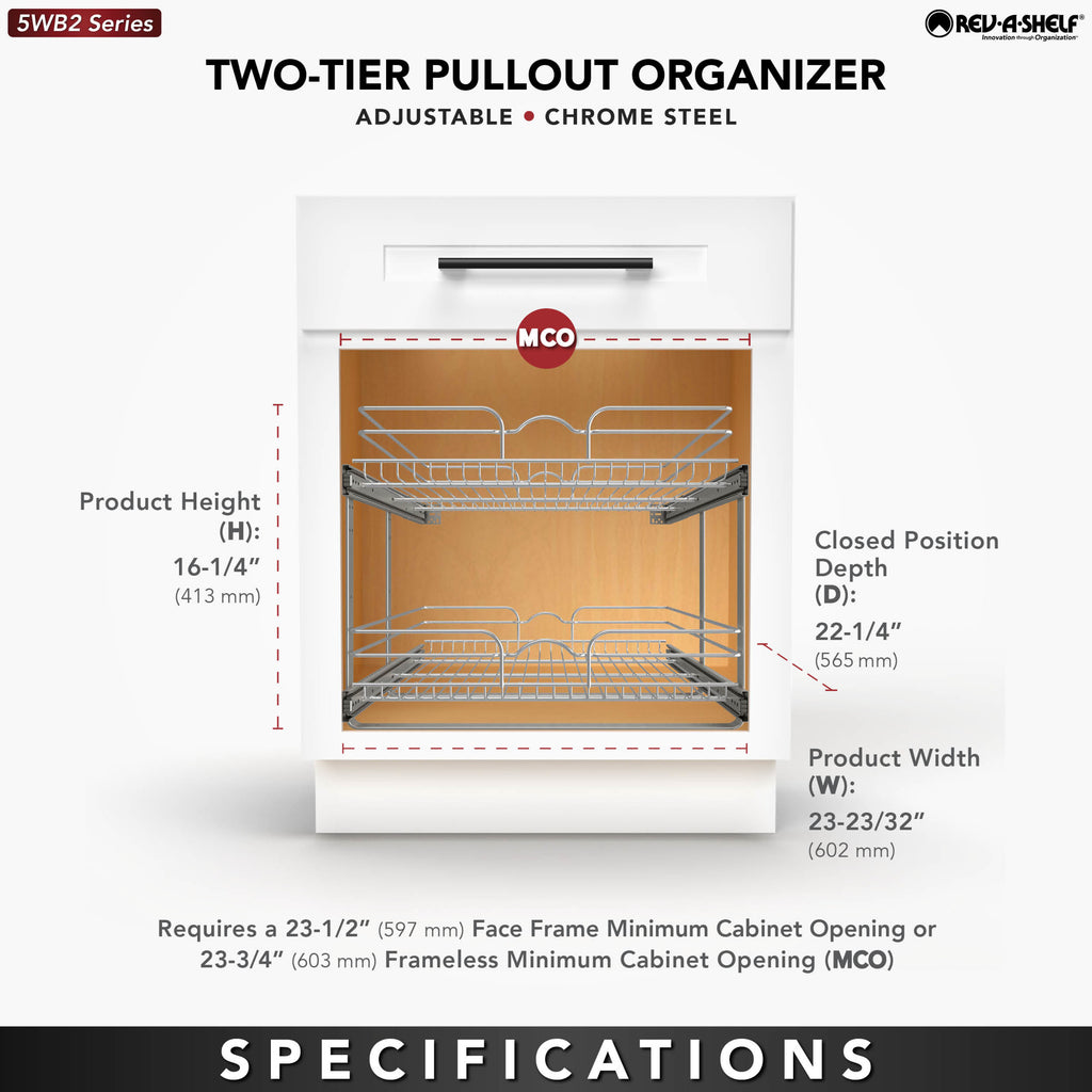 The redesigned Rev-A-Shelf® Two-Tier Baskets make other 2-shelf units fail in comparison. With the heavy-gauge construction, ball-bearing slides on both baskets and multiple mounting points, this is the best two-tier unit available. With 100lb slides on each basket you don't have to worry about overloading or bending. Multiple sized width and depths are available, so you are sure to find the exact unit that fits your exact cabinet size. Optimize the performance, by adding the optional door mount kit to add a truly one-step opening/closing process (sold separately - 5WB-DMKIT).. Included: (1) top basket, (1) bottom basket, (2) u-shape supports, (2) rear mounting brackets and hardware