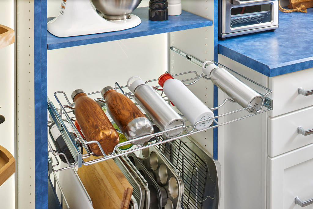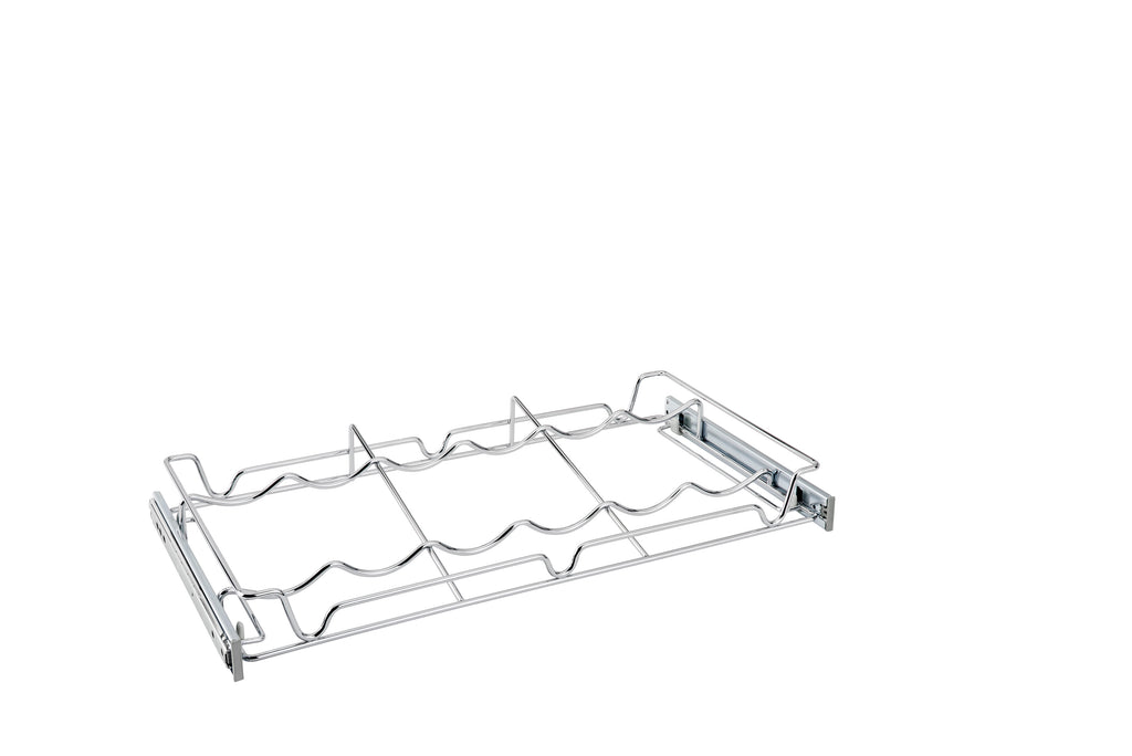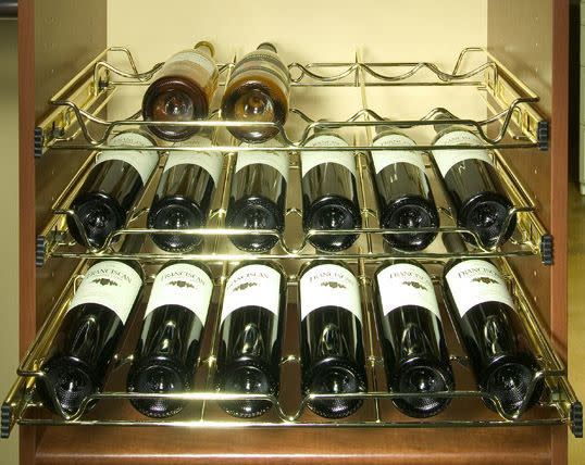 Create a pantry or bar that is the envy of all your friends with Deluxe Sliding Wine Racks. Their unique design lets you see your wine bottles entirely just by pulling the product out of the cabinet. This organizer glides on full-extension slides and the angled design keeps your corks wet, preventing spoilage. So, don't wait any longer, get the wine storage solution that any Sommelier would be proud to have. Go from selection to serving is just seconds!. Included: (1) Wine Rack, (1) Pair of slides and mounting hardware