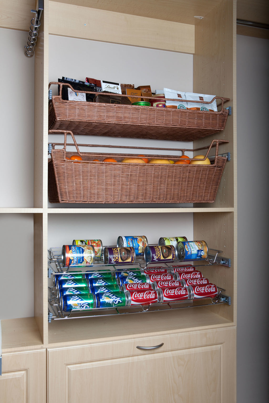 Stop looking at your pantry head-on and start seeing things from a different, more accessible angle with our Deluxe Sliding Spice/Can Rack. The unique design lets you see items entirely just by pulling the product out of the cabinet. This organizer glides on full-extension slides, and the angled design lets you see all your spices and cans (including soda cans), they are perfect for various applications like pantries, bars, really the options are endless. So, stop searching and stacking, one pull, and you are sure to find what you're looking for in a jiffy. See what you have at a glance!. Included: (5) Chrome spice/can rack, (5) 14" Depth zinc right and left ball-bearing slides; (20) M5 X 9.5 mm. Euro screws