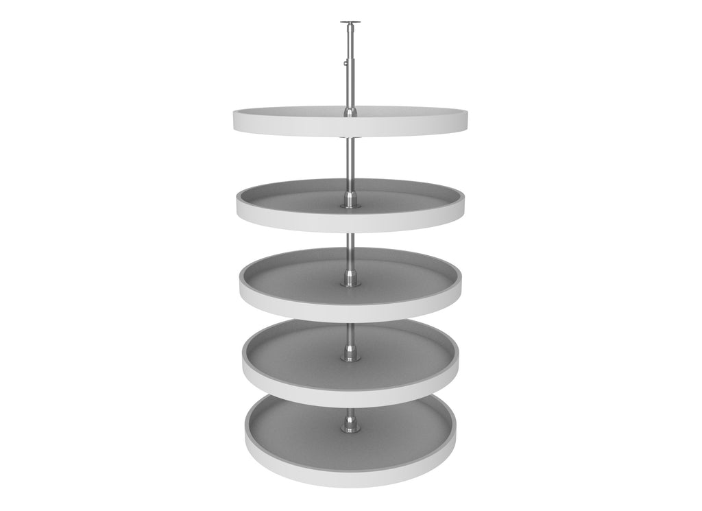 If you are looking for the best polymer susan for your tall pantry cabinet, you are in the right place. Revered as the best in the industry, The Rev-A-Shelf® Polymer full-circle 5-shelf pantry susans available in 16", 18", 20", 24" and 32" diameters that come with a durable chrome post and hubs. The smooth polystyrene shelves come with an adjustable telescoping post that allows each shelf to rotate independently.. Included: (5) White Full-Circle Polymer Shelves (1) telescoping post and mounting hardware
