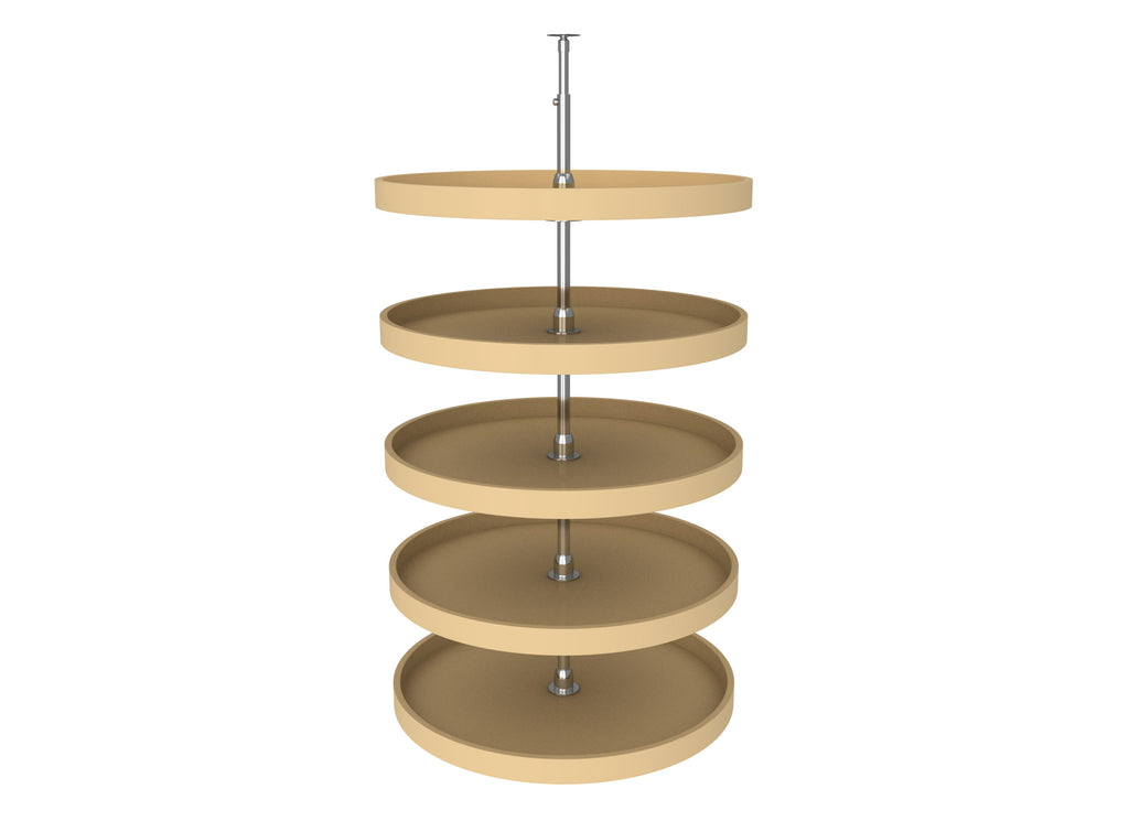 If you are looking for the best polymer susan for your tall pantry cabinet, you are in the right place. Revered as the best in the industry, The Rev-A-Shelf® Polymer full-circle 5-shelf pantry susans available in 16", 18", 20", 24" and 32" diameters that come with a durable chrome post and hubs. The smooth polystyrene shelves come with an adjustable telescoping post that allows each shelf to rotate independently.. Included: (5) Almond Full-Circle Polymer Shelves (1) telescoping post and mounting hardware