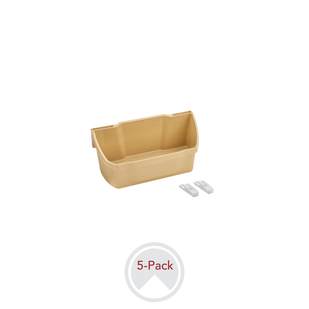 Expand cabinet space with this handy tray door storage set. The 6230 Series is available in three different sizes and is easy to install with screw-in clips or mount the trays to 24"or 58" aluminum standards with tray clips (sold separately). Sets are available in white or almond.. Included: (5) Almond Plastic bins and mounting hardware