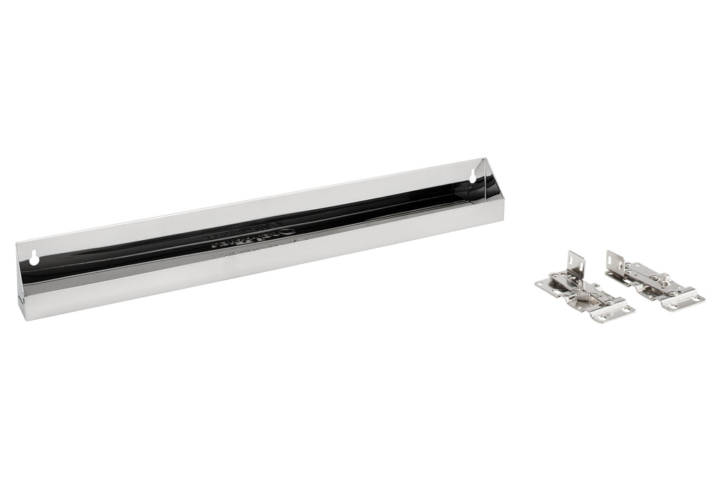 Need storage flexibility around your sink? Add a little luxury to otherwise wasted space with a stainless-steel tip-out tray. Perfect for your kitchen or bathroom.. Included: (1) Stainless-Steel tray, (1) pair of hinges and mounting hardware