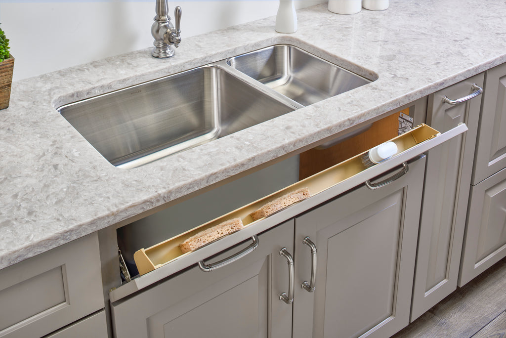 Tip-Out Trays are a must-have for every kitchen and bathroom! Perfect for hiding sponges and scouring pads out of sight yet keeping them easily accessible. The Slim Series is designed to accommodate minimum clearance openings for large sink applications. The 6540 Series is available in 11" or 14" solid or extruded tray kits in white or almond.. Included: (1) Almond Tip-Out Tray, (2) pair of hinges and Mounting Hardware