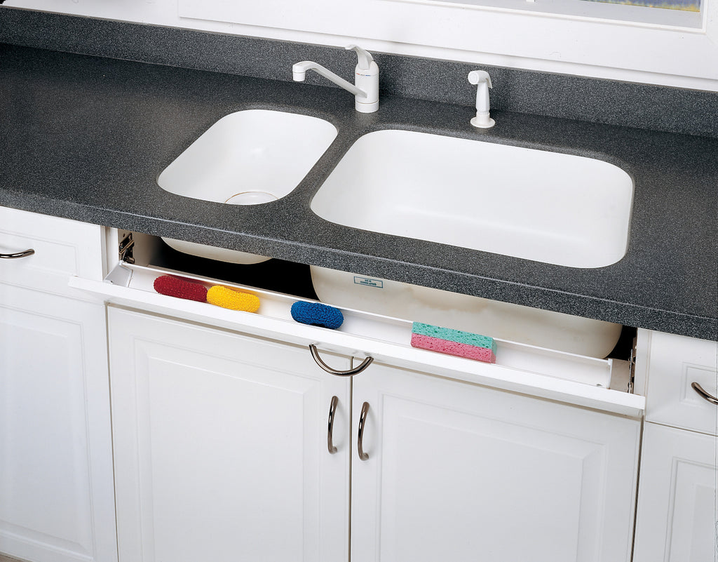 Tip-Out Trays are a must-have for every kitchen and bathroom! Perfect for hiding sponges and scouring pads out of sight yet keeping them easily accessible. The Slim Series is designed to accommodate minimum clearance openings for large sink applications. The added upgrade of soft-close hinges will eliminate and accidental slamming closed.. Included: (1) White Tip-Out Tray, (1) pair of hinges and Mounting hardware