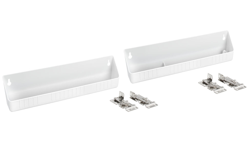 Rev-A-Shelf® most popular Sink Front Tip-Out Tray Set. The 6572 Series includes one conventional open tray, one accessory tray with ring holder and soap dish, and 2 pairs of self-holding hinges. The 6572 Series is made of high-impact polystyrene and is available in 11" or 14" sizes.. Included: (2) White trays, (2) pair of hinges and mounting hardware