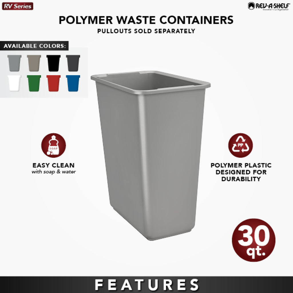 Do you just simply need a replacement or new trash bin? Rev-A-Shelf® polymer bins are not only made in the USA, but injection molded with the highest quality Polypropylene. Though designed to work with ALL of the Rev-A-Shelf® waste containers and trash pull-outs, they can be used for extra trash storage no matter where you need it. Available in variety of sizes and colors.. Included: (1) Silver 30 qt. waste container only