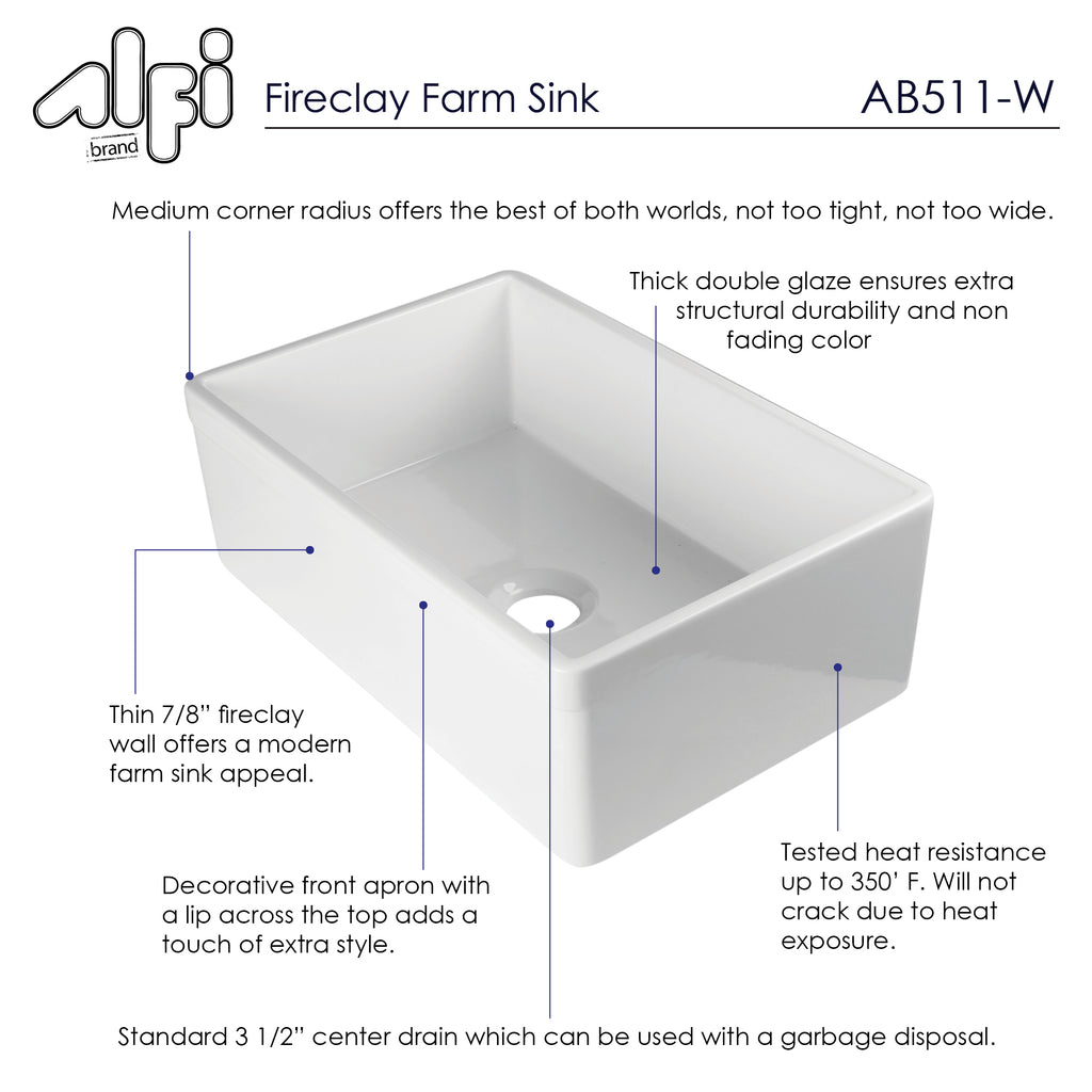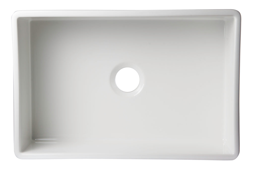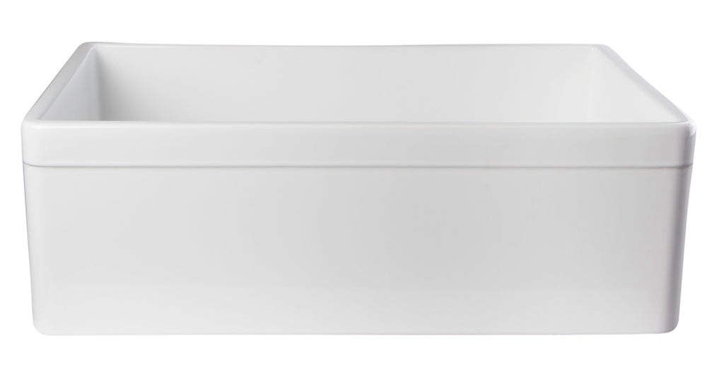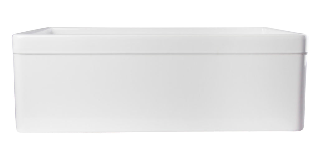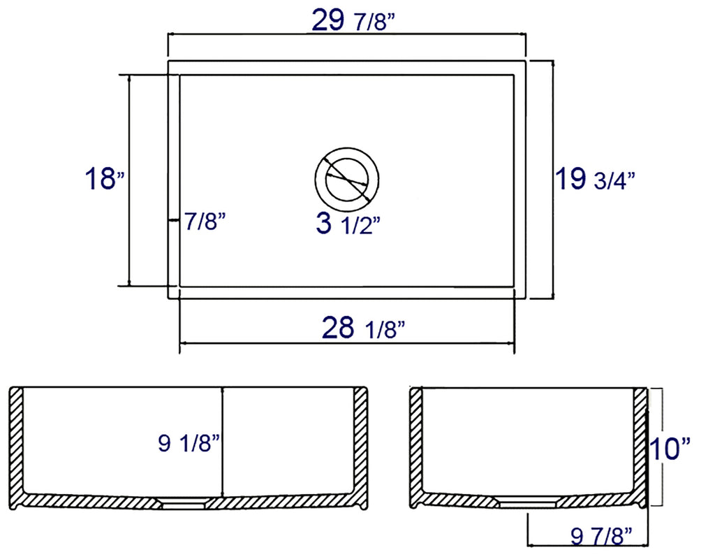 Dimensions: 29.88 x 19.75 x 10. Bottom Width : 29 1/2" Top Width : 29 7/8" . This sink tapers from top to bottom by 1/4" Wall Thickness : 3/4" Inner Dimensions 28 1/8" x 18" x 9 1/8" Non Reversible Can be installed via Under-Mount (countertop Over edge of sink), Top-Mount (countertop Under edge of sink), or Flush-Mount (countertop Even with sink) This sink is constructed of solid high-grade fireclay material using high pressure casting, ensuring durability, longevity, and resilience to acids, alkali's, scratches, and chipping. Certified by Uniform Plumbing Code (cUPC) 1 year warranty against manufacturing defects. 10 year warranty against fading / staining of the glaze.