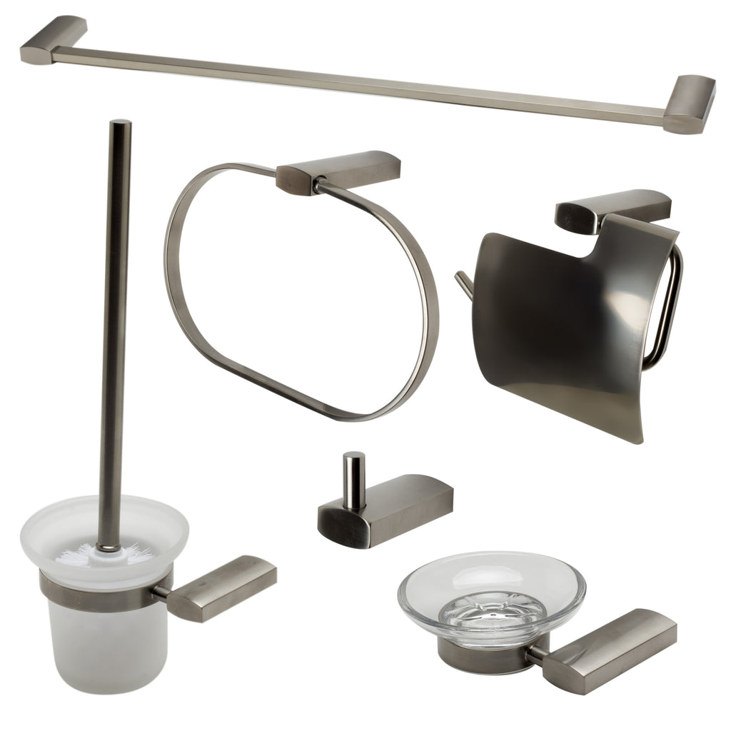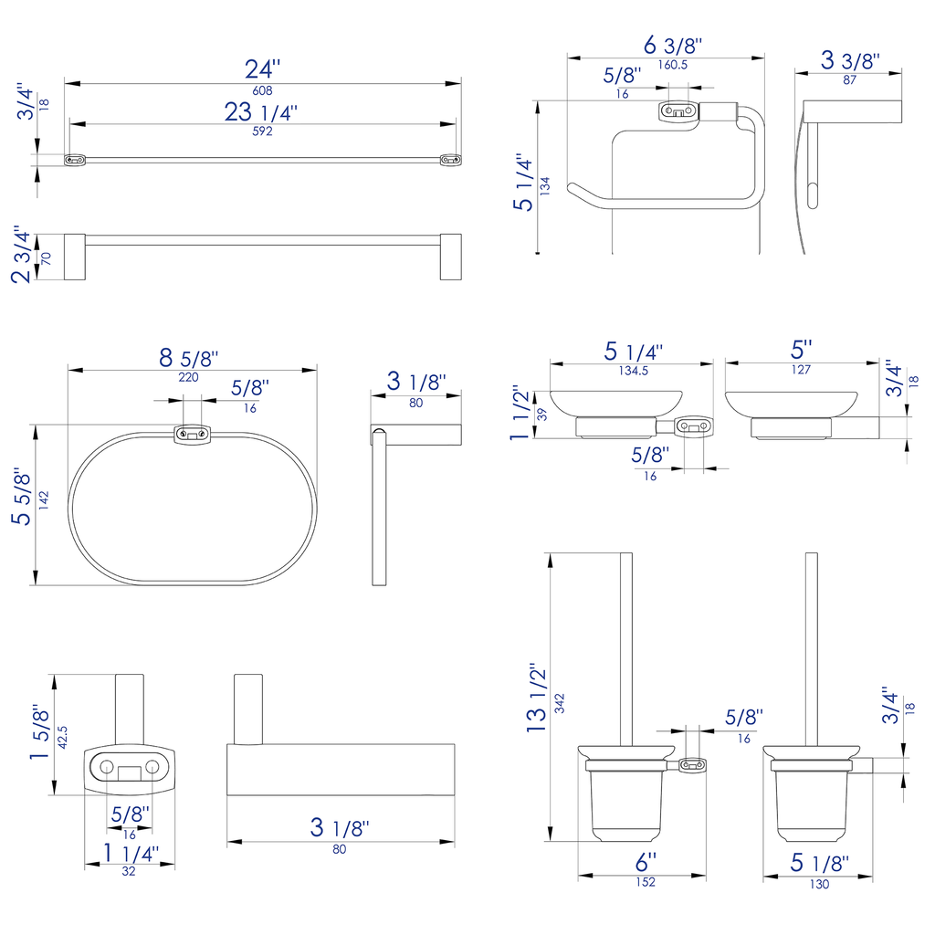 Dimensions: 24 x 2.75 x 0.75. 6 Piece Set Includes: Towel Bar, Towel Ring, Robe Hook, Soap Dish, Toilet Brush Holder & Toilet Paper Holder. Expertly crafted solid brass construction for long-lasting durability. Sleek design matches most décor styles. Save money by purchasing a whole set instead of individual items. Premium grade materials that feel and look luxurious. 1 year warranty against manufacturing defects.