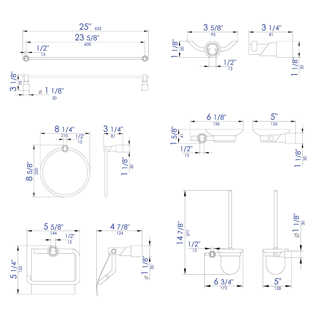 Dimensions: 25 x 3.13 x 1.13. 6 Piece Set Includes: Towel Bar, Towel Ring, Robe Hook, Soap Dish, Toilet Brush Holder & Toilet Paper Holder. Expertly crafted solid brass construction for long-lasting durability. Sleek design matches most décor styles. Save money by purchasing a whole set instead of individual items. Premium grade materials that feel and look luxurious. 1 year warranty against manufacturing defects.