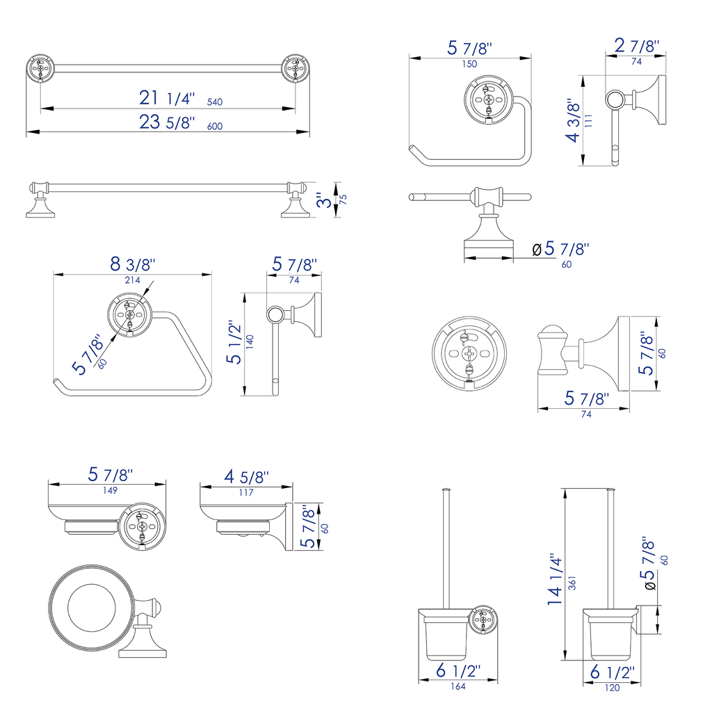 Dimensions: 23.63 x 3 x 1. 6 Piece Set Includes: Towel Bar, Towel Ring, Robe Hook, Soap Dish, Toilet Brush Holder & Toilet Paper Holder. Expertly crafted solid brass construction for long-lasting durability. Sleek design matches most décor styles. Save money by purchasing a whole set instead of individual items. Premium grade materials that feel and look luxurious. 1 year warranty against manufacturing defects.