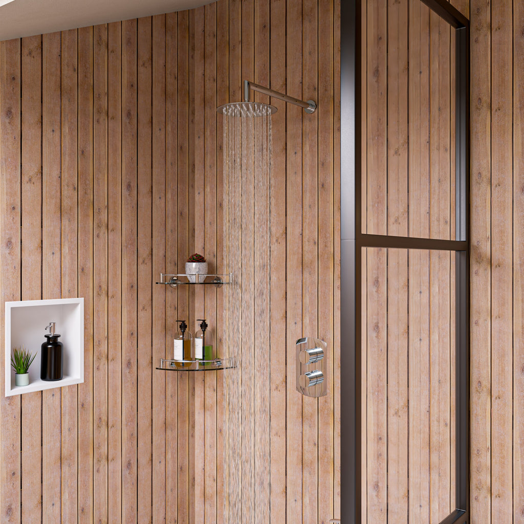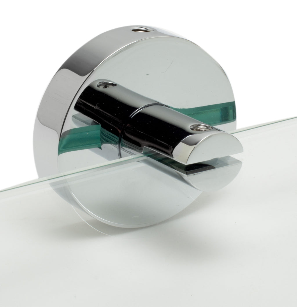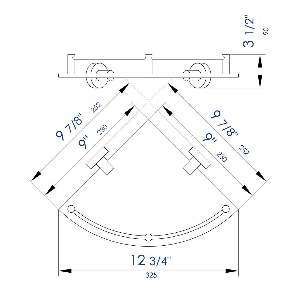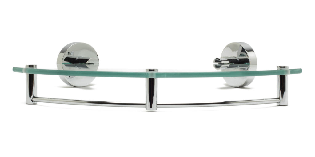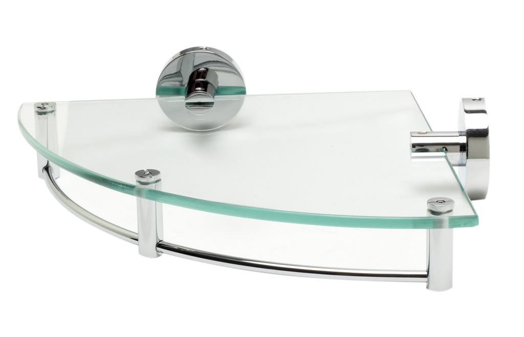 Dimensions: 12.75 x 9.88 x 3.5. Includes one corner mounted rounded clear glass shelf with chrome accents. Expertly crafted solid brass construction for long-lasting durability. Sleek design matches most décor styles. Concealed wallmount installation keeps your bathroom esthetics on point. Corner shelves make the best use of space in tight shower spaces. 1 year warranty against manufacturing defects.
