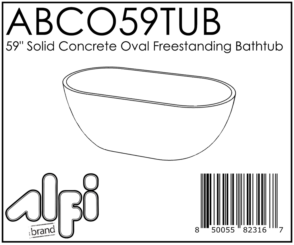 Dimensions: 59 x 29.5 x 20.5. Distinctive 59" x 29.5" modern oval design that effortlessly commands attention. In contrast to other tub materials, concrete tubs retain heat, enhancing the comfort of your soaking experience. This tub requires that you purchase a floor mounted or wall mounted tub filler. No faucets or pre-drilled holes included. Free standing tub. Can be installed anywhere with a floor drain outlet. Includes polished chrome pop-up drain. Also available in 63' and 72' oval size as models: ABCO63TUB and ABCO72TUB Explore our range of concrete sinks, accessories, and more for a complete bathroom transformation. 1 year warranty against manufacturing defects.