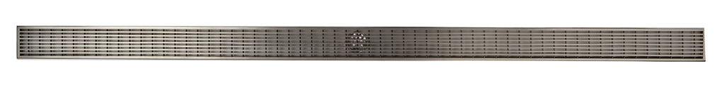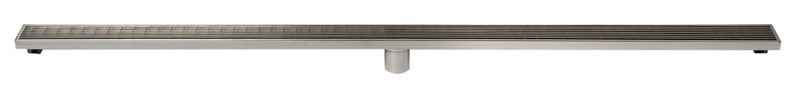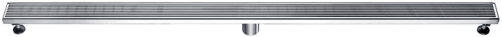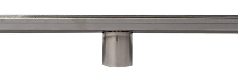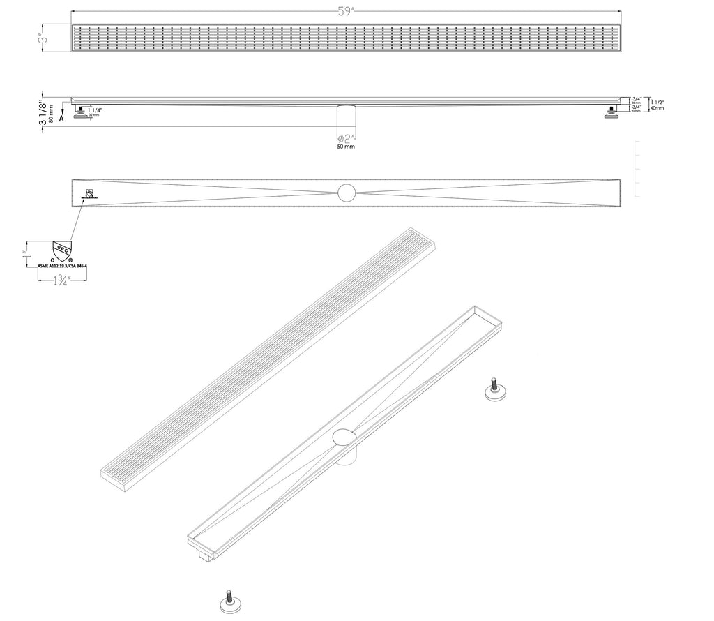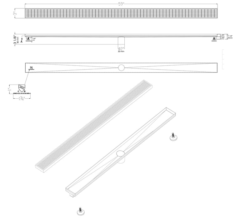 Dimensions: 59 x 3 x 3.15. 18 Gauge premium grade 304 series stainless steel. 2" slip in drain diameter. This linear drain includes a cover with a groove hole pattern. Shower drain base not included but is required and available as model # ABDB55 in PVC or ABDB55CI in Cast Iron. 1 year warranty against manufacturing defects.