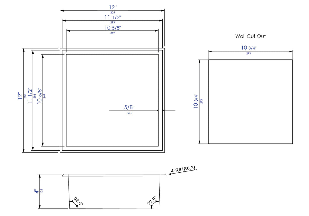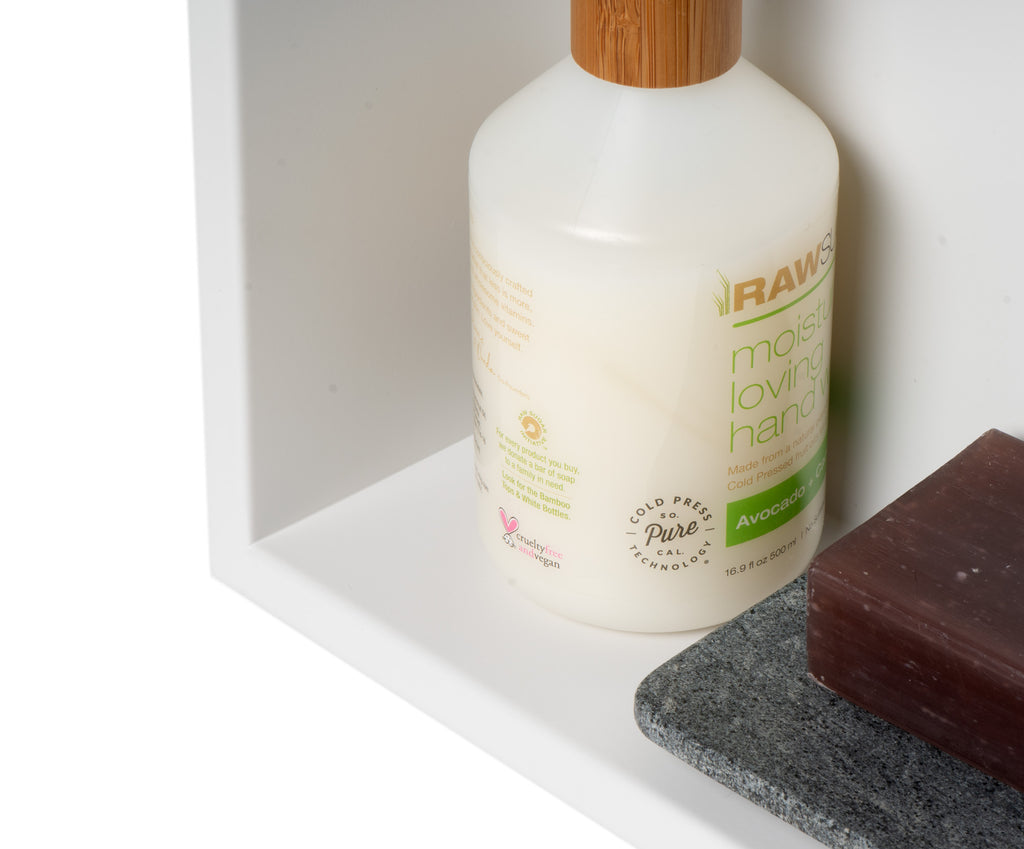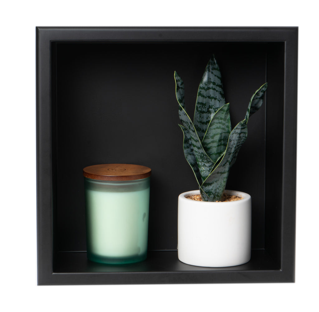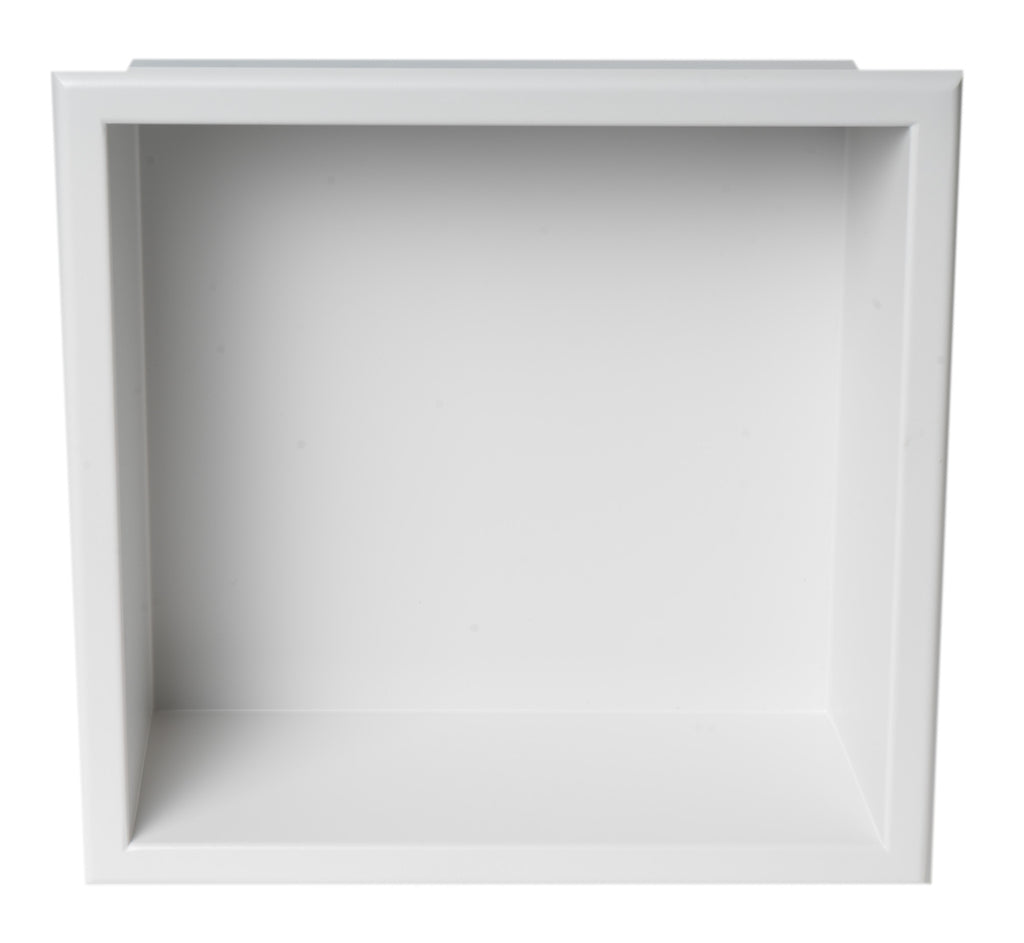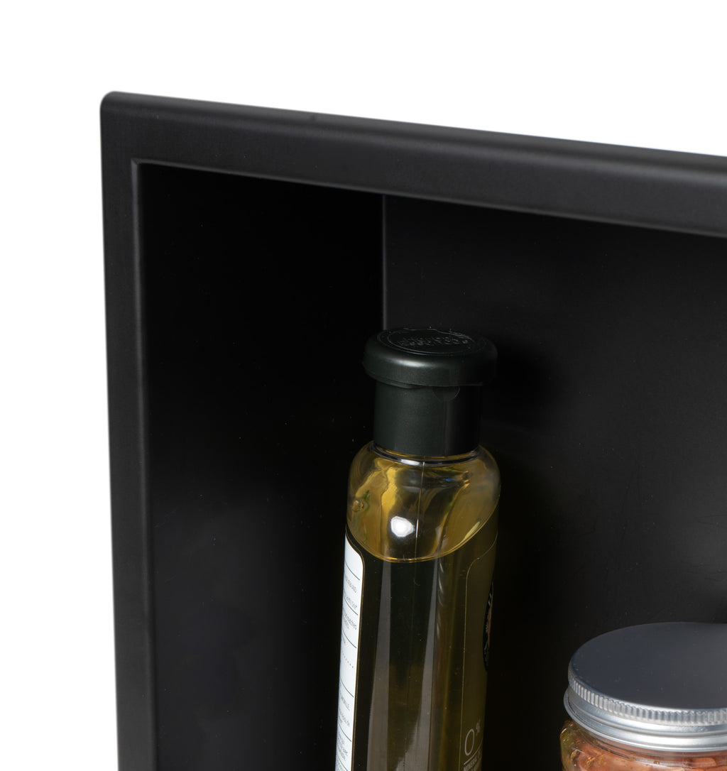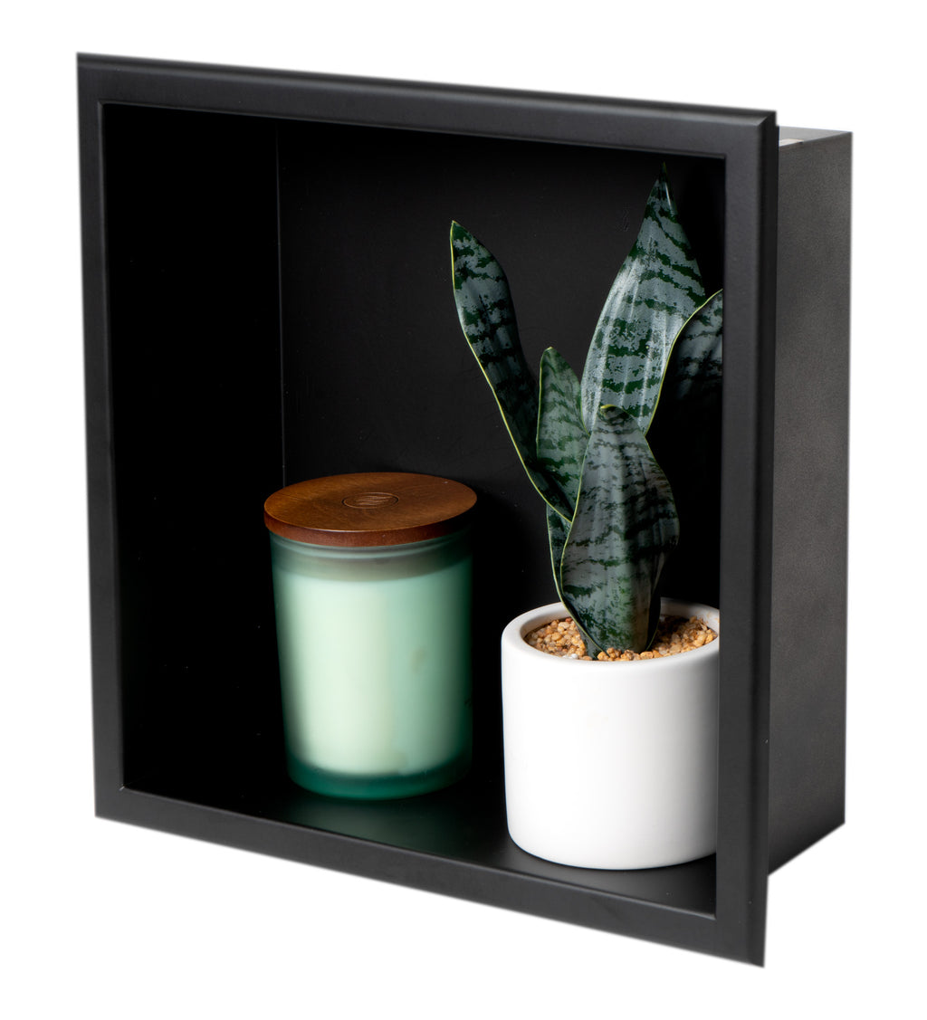 Dimensions: 12 x 12 x 4. Enjoy the sleek look of this stainless steel niche powder coated with a matte black finish that resists fingerprints and makes a statement in any home. Save hundreds of dollars over tiled niches; unlike traditional niches that require extra labor and expensive tile work, this niche is fully finished and ready to mount into your wall opening. Not just for your shower! This recessed niche adds convenient space to use for storage, decor or more. The neutral matte black color makes this niche the perfect modern choice for easy to install recessed shelving anywhere. The black color makes a statement and can become a center piece that matches effortlessly with other matte black hardware. Please note that the shampoo, soap and other accessories shown in some of the images are for demonstration purposes only and are not included. Includes adhesive strips on the back edges and easy-to-follow instructions for fast 3 step installation. Made of solid 304 series stainless steel which is waterproof and rustproof. Perfect for a wet environment. Installs between studs for a neat, recessed appearance. Interior Size: 10 5/8" x 10 5/8" x 3 7/8". The wall cut out dimensions are 10 3/4" x 10 3/4" 1 year warranty against manufacturing defects.