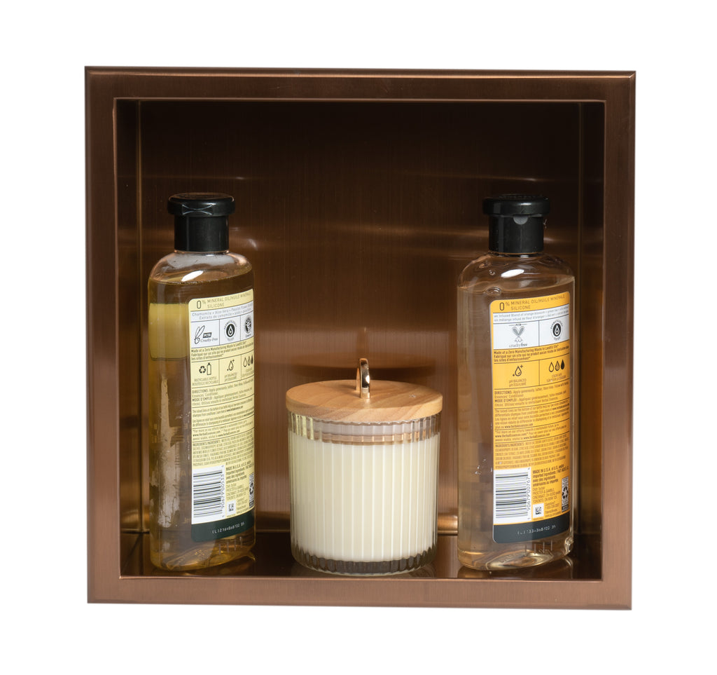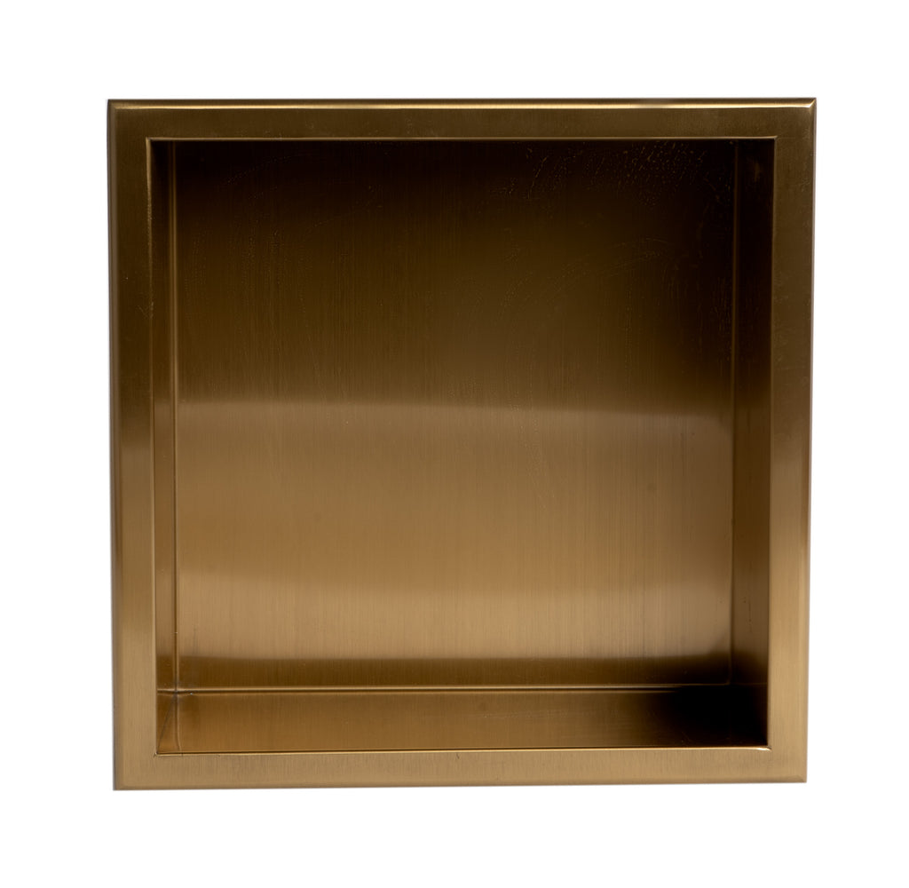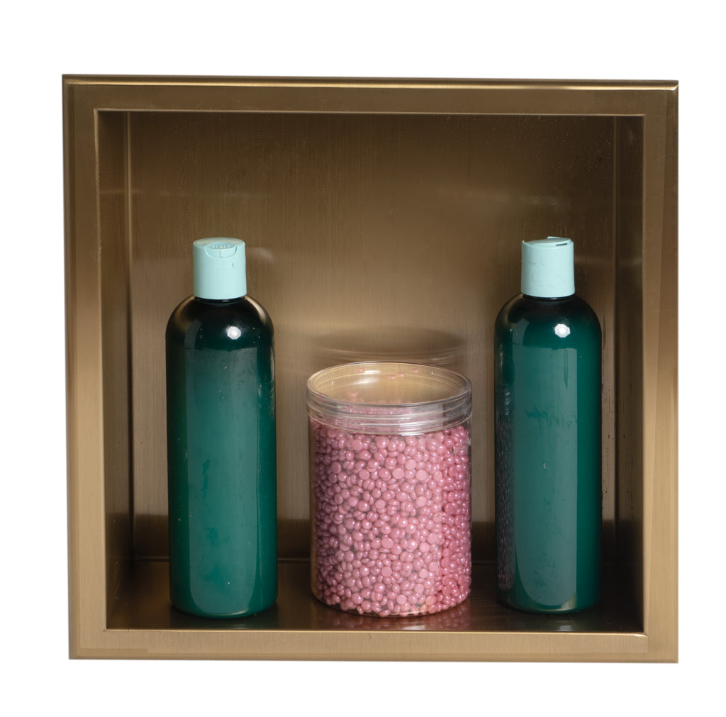 Dimensions: 12 x 12 x 4. Enjoy the sleek look of this stainless steel niche with a super durable PVD finish that resists fingerprints and makes a statement in any home. Save hundreds of dollars over tiled niches; unlike traditional niches that require extra labor and expensive tile work, this niche is fully finished and ready to mount into your wall opening. The compact size stores your necessities. Need more space? You can always get additional pieces for a wall with two or more of these small square niches. Stack them vertically or horizontally; the choice is yours. Not just for your shower! This recessed niche adds convenient space to use for storage, decor or more. The neutral black color makes this niche the perfect modern choice for easy to install recessed shelving anywhere. The black color makes a statement and can become a centerpiece that matches effortlessly with other matte black hardware. Please note that the shampoo, soap and other accessories shown in some of the images are for demonstration purposes only and are not included. Includes adhesive strips on the back edges and easy-to-follow instructions for fast 3 step installation. Sloped on the long horizontal side by approximately 2 degrees to allow for quick water drainage out of the niche. Installs between studs for a neat, recessed appearance. 1 year warranty against manufacturing defects.