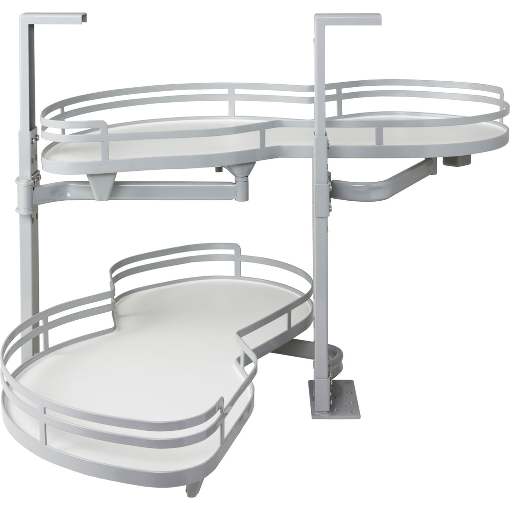 Turn blind corner cabinets into an easily accessible storage solution with an 18" Blind Corner Swingout in Grey Finish with White Shelves. Unit includes two trays that have independent movement and two structure support posts. The height of the shelves is adjustable. Smooth pivot movement of shelves and metal railing ensures items stay secure in and out of the cabinet. Left-handed units are for openings that are on the left of the blind. Requires an 18" minimum opening for 1-1/2" face frame applications and 19-1/2" opening in frameless and cabinets with less than 1-1/2" face frame. Fits cabinet interior heights from 20" to 29-1/2". To view available specifications and installation instructions select all product options., Turn blind corner cabinets into an easily accessible storage solution with an 18" Blind Corner Swingout in Grey Finish with White Shelves. Unit includes two trays that have independent movement and two structure support posts. The height of the shelves is adjustable. Smooth pivot movement of shelves and metal railing ensures items stay secure in and out of the cabinet. Left-handed units are for openings that are on the left of the blind. Requires an 18" minimum opening for face frame applications and 19-1/2" opening in frameless., Left-handed units are for openings that are on the left of the blind, Metal edging finishes coordinate with popular decorative hardware finishes, Easy installation - no need to drill into the side walls, mounts directly to cabinet floor with optional top mounting for additional stability, Installation instructions and mounting hardware included, For full height base cabinets, , , ,