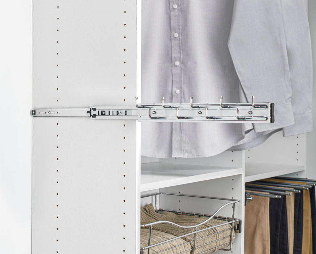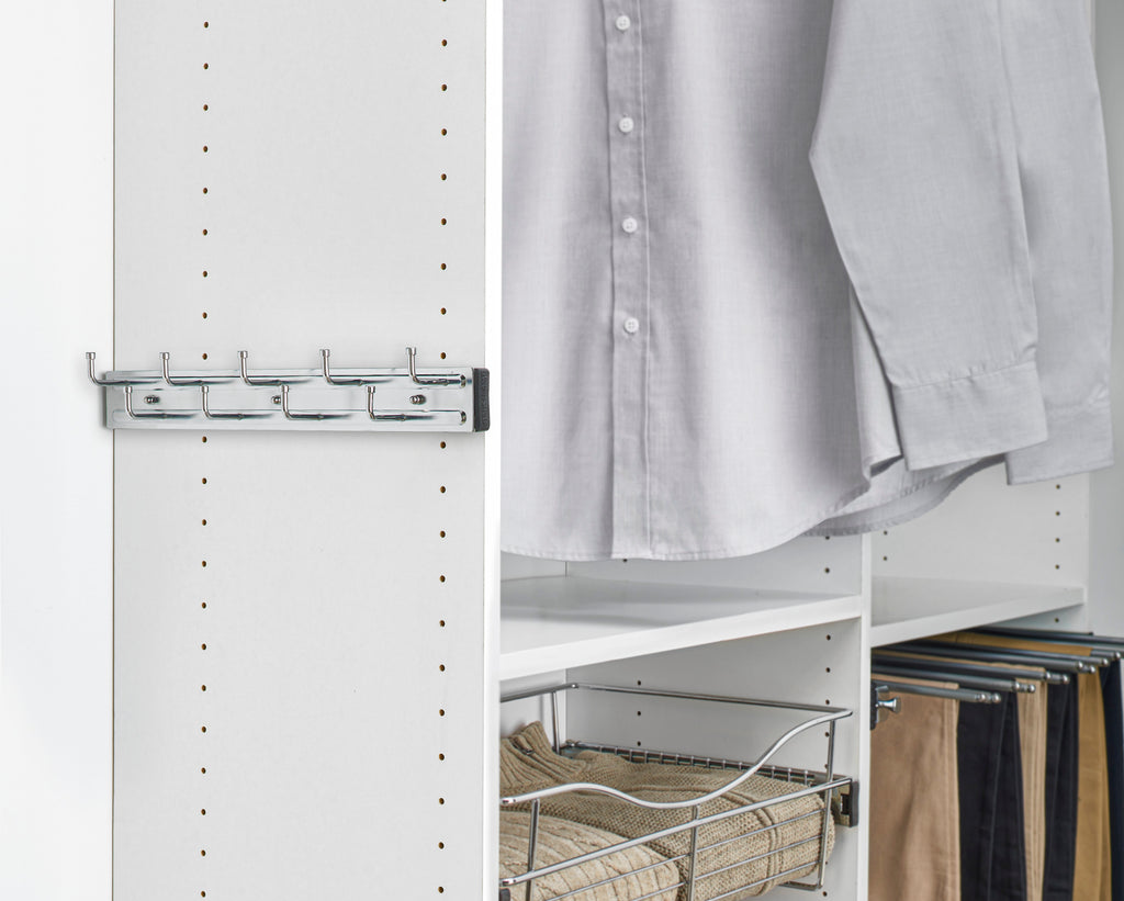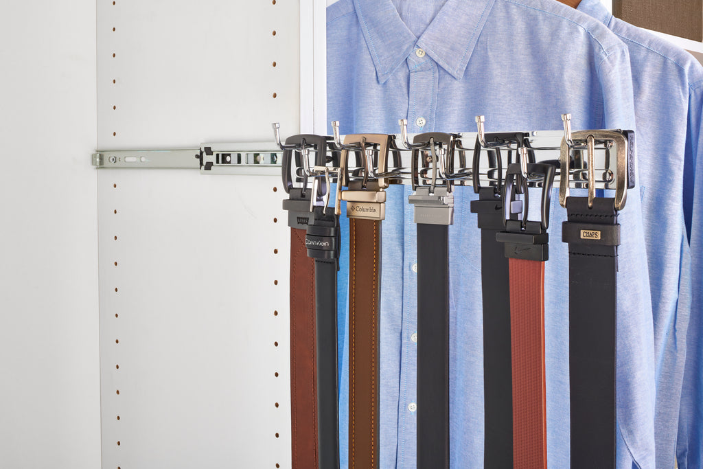 Beautify your belts with the BRC Series Side Mount Belt Rack! Available in static and pullout versions, these racks hold up to (9) belts and are available in multiple sizes and finishes.. Included: (1) Chrome rack and mounting hardware