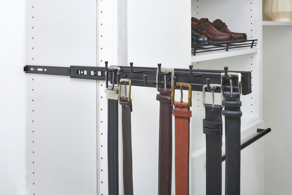 Beautify your belts with the BRC Series Side Mount Belt Rack! Available in static and pullout versions, these racks hold up to (9) belts and are available in multiple sizes and finishes.. Included: (1) Matte Black Belt Rack and mounting hardware