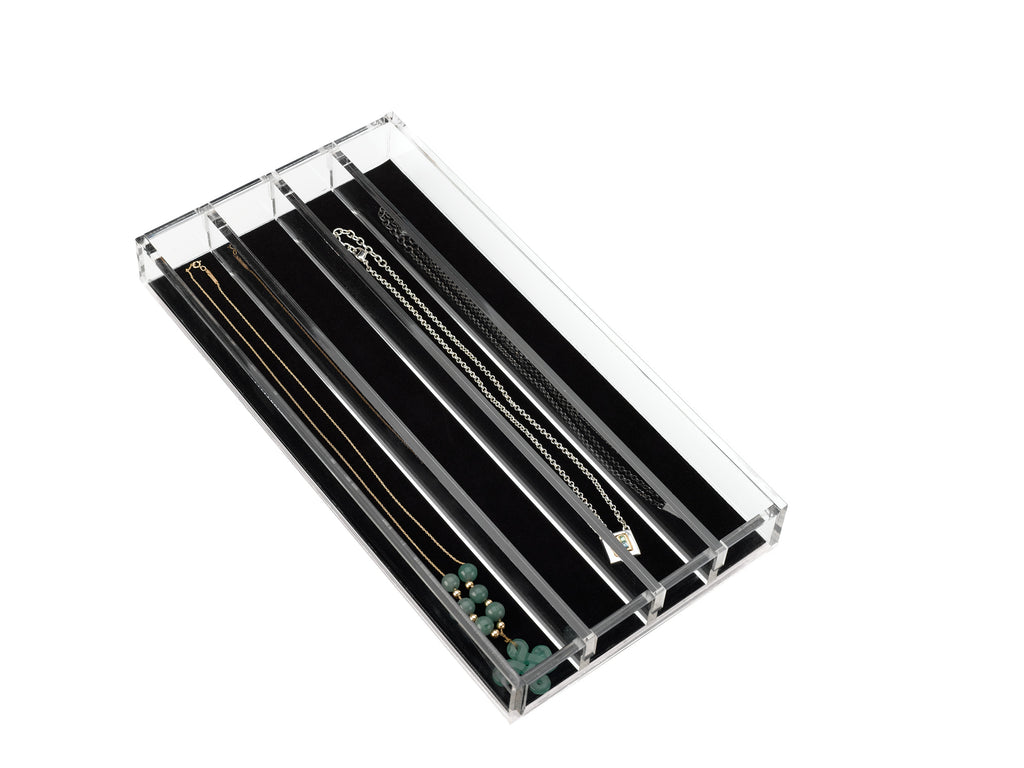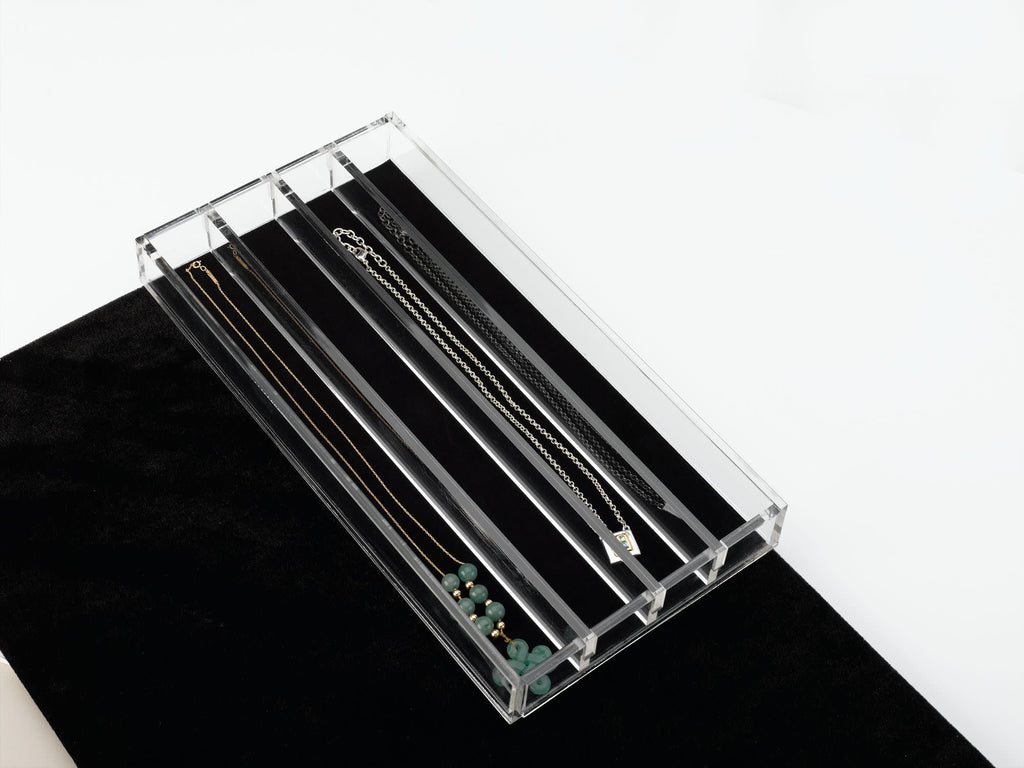 Used in coordination with CVJD Undermount Jewelry Drawers these velvet lined accessories are designed to give you the ability to organize delicate items like rings, bracelets and necklaces. The clear acrylic sides make it easy to see all your items. Adjustable dividers provide customization for jewelry in various styles and sizes.. Included: (1) Acrylic drop-in organizer