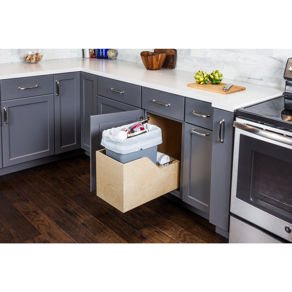 Neatly tuck away trash cans with this beautiful solid wood soft-close trashcan rollout for a hinged door application. Ships fully preassembled with one 35 qt grey plastic trash bin. Simply take out of box and screw to bottom of cabinet floor with four screws. Designed for cabinets with a 12" opening width. To view available specifications and installation instructions select all product options., Neatly tuck away trash cans with this beautiful solid wood soft-close trashcan rollout for a hinged door application. Ships fully preassembled with one 35 qt grey plastic trash bin. Simply take out of box and screw to bottom of cabinet floor with four screws. Designed for cabinets with a 12" opening width., Designed for cabinets with 12" minimum opening width, Features 100 lb. full extension soft-closing concealed undermount slides, UV coated edge banded birch plywood construction, Includes chrome-plated wire basket for storage of trash bags, , Assembled in the USA, , ,