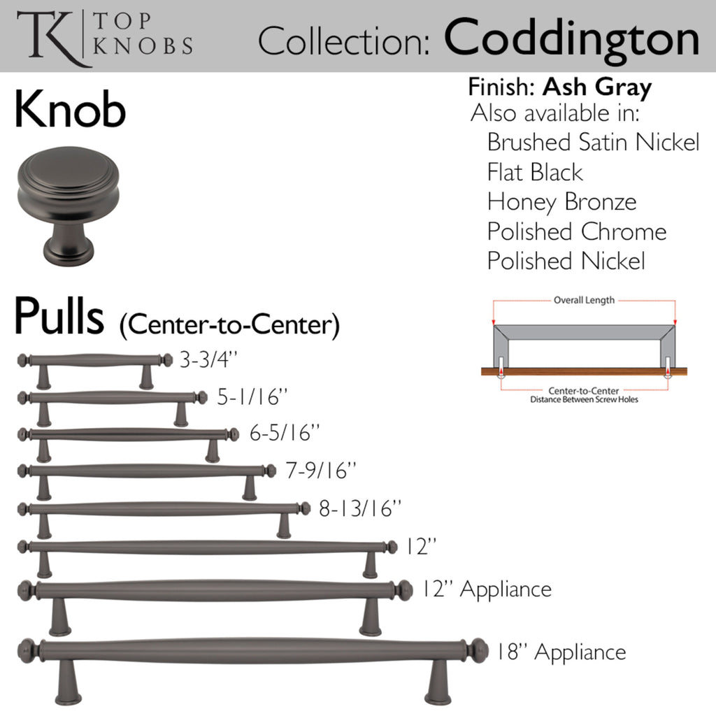 The Coddington pull exudes a smooth, sophisticated flair through its subtle nuances. Its intricate banding, gracefully curved ends, and delicate feet imbue the collection with a distinct character, enabling homeowners and designers to add a touch of elegance to any project. From kitchens and bathrooms to laundry rooms and home offices, Top Knobs decorative cabinet hardware continues to shape home design. Top Knobs offers the most extensive line of premium cabinet hardware allowing the creative freedom to complete the perfect look. Leave the finishing touch to the brand designers trust!, The Coddington pull exudes a smooth, sophisticated flair through its subtle nuances. Its intricate banding, gracefully curved ends, and delicate feet imbue the collection with a distinct character, enabling homeowners and designers to add a touch of elegance to any project. From kitchens and bathrooms to laundry rooms and home offices, Top Knobs decorative cabinet hardware continues to shape home design. Top Knobs offers the most extensive line of premium cabinet hardware allowing the creative freedom to complete the perfect look. Leave the finishing touch to the brand designers trust!, Complete collection with a coordinating knob available, If you like the way the Coddington pull looks, you'll love the way it feels!, Complete collection with a coordinating knob available, If you like the way the Coddington pull looks, you'll love the way it feels!, Finishes that will withstand the rigors of daily use, Buy with confidence knowing Top Knobs offers a Lifetime Warranty, , , , ,