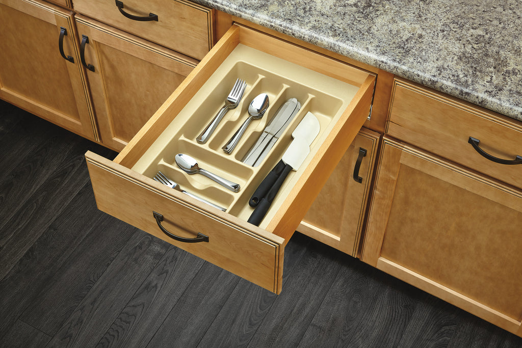 Rev-A-Shelf® Drawer Inserts are the best if you are looking for a custom look. Why settle for a cutlery insert that just drops in your drawer and moves every time you open and close your drawer? Create a custom fit by trimming to your exact size. Available in multiple sizes, colors and finishes.. Included: (1) Almond Rubberized Polystyrene drop-in organizer