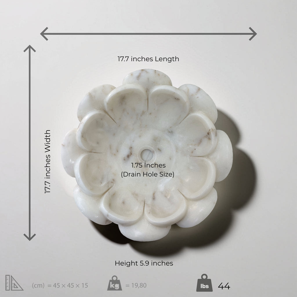 Elevate your bathroom to a realm of luxury with the handcrafted White Marble Flower-Shaped Vessel Sink. Expertly carved from premium white marble, this stunning sink features a delicate petal design, resembling a blooming flower. The smooth polished finish beautifully enhances the natural allure of the marble, making this sink a true statement piece for both modern and classic interiors.