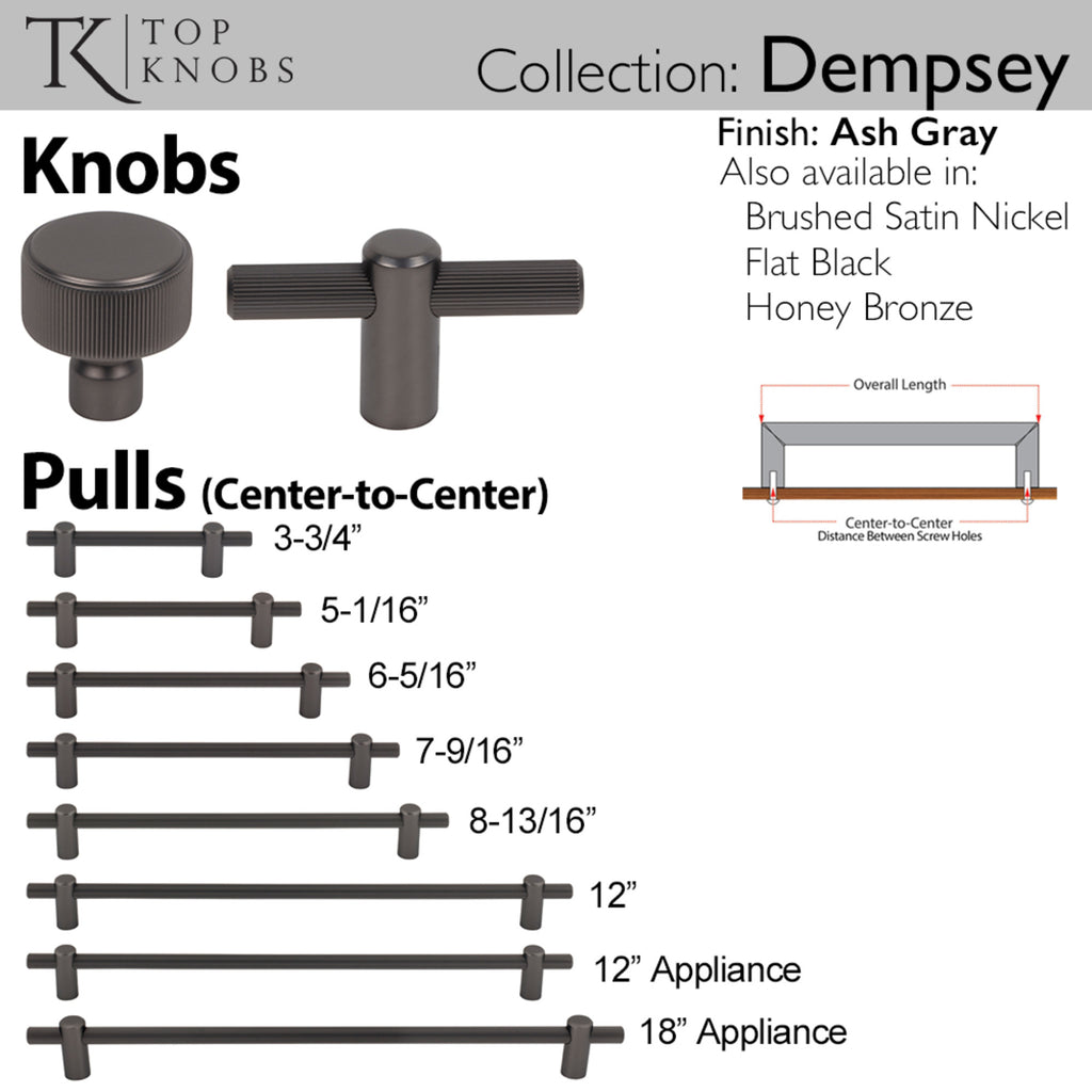The pull from the Top Knobs Dempsey collection impresses with its mix of sleek surfaces and touchable textures—it's stunning and oh-so-chic. With its straight-line knurling, it complements modern cabinets and industrial styles beautifully. From kitchens and bathrooms to laundry rooms and home offices, Top Knobs decorative cabinet hardware continues to shape home design with a range of options. Top Knobs offers the most extensive line of premium cabinet hardware allowing the creative freedom to complete the perfect look. Leave the finishing touch to the brand designers trust!, The pull from the Top Knobs Dempsey collection impresses with its mix of sleek surfaces and touchable textures—it's stunning and oh-so-chic. With its straight-line knurling, it complements modern cabinets and industrial styles beautifully. From kitchens and bathrooms to laundry rooms and home offices, Top Knobs decorative cabinet hardware continues to shape home design with a range of options. Top Knobs offers the most extensive line of premium cabinet hardware allowing the creative freedom to complete the perfect look. Leave the finishing touch to the brand designers trust!, Complete collection with coordinating knobs available, If you like the way the Dempsey pull looks, you'll love the way it feels!, Complete collection with coordinating knobs available, If you like the way the Dempsey pull looks, you'll love the way it feels!, Finishes that will withstand the rigors of daily use, Buy with confidence knowing Top Knobs offers a Lifetime Warranty, , , , ,