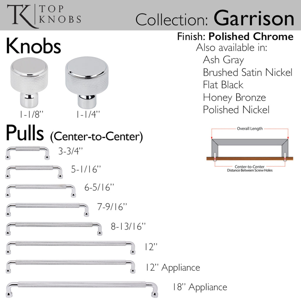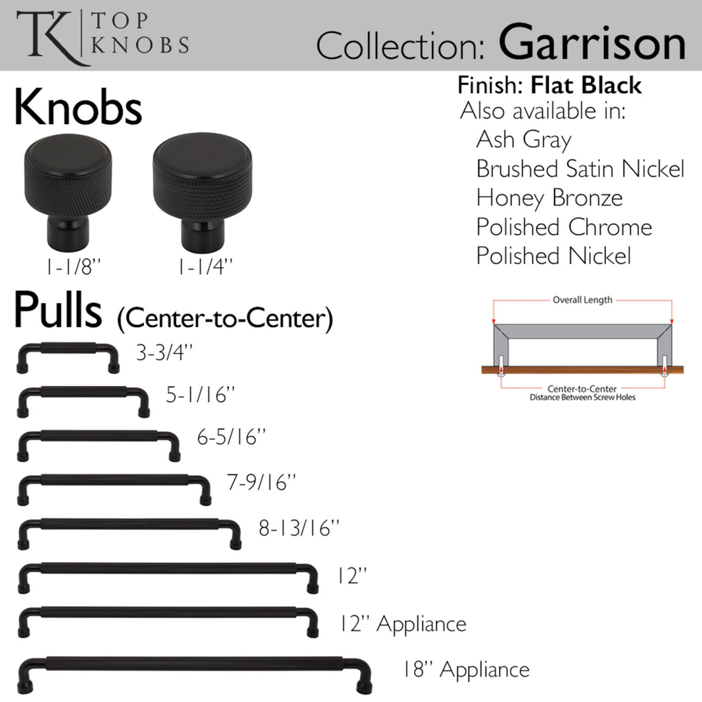 Enhance your space with sophistication and a tactile appeal. The Garrison pull from Top Knobs showcases a refined and contemporary industrial design. Its rounded pull, featuring a textured center, crafts an elegant, masculine aesthetic. From kitchens and bathrooms to laundry rooms and home offices, Top Knobs decorative cabinet hardware continues to shape home design with a range of options. Top Knobs offers the most extensive line of premium cabinet hardware allowing the creative freedom to complete the perfect look. Leave the finishing touch to the brand designers trust!, Enhance your space with sophistication and a tactile appeal. The Garrison pull from Top Knobs showcases a refined and contemporary industrial design. Its rounded pull, featuring a textured center, crafts an elegant, masculine aesthetic. From kitchens and bathrooms to laundry rooms and home offices, Top Knobs decorative cabinet hardware continues to shape home design with a range of options. Top Knobs offers the most extensive line of premium cabinet hardware allowing the creative freedom to complete the perfect look. Leave the finishing touch to the brand designers trust!, Complete collection with coordinating knobs available, If you like the way the Garrison pull looks, you'll love the way it feels!, Complete collection with coordinating knobs available, If you like the way the Garrison pull looks, you'll love the way it feels!, Finishes that will withstand the rigors of daily use, Buy with confidence knowing Top Knobs offers a Lifetime Warranty, , , , ,