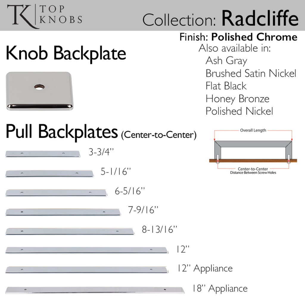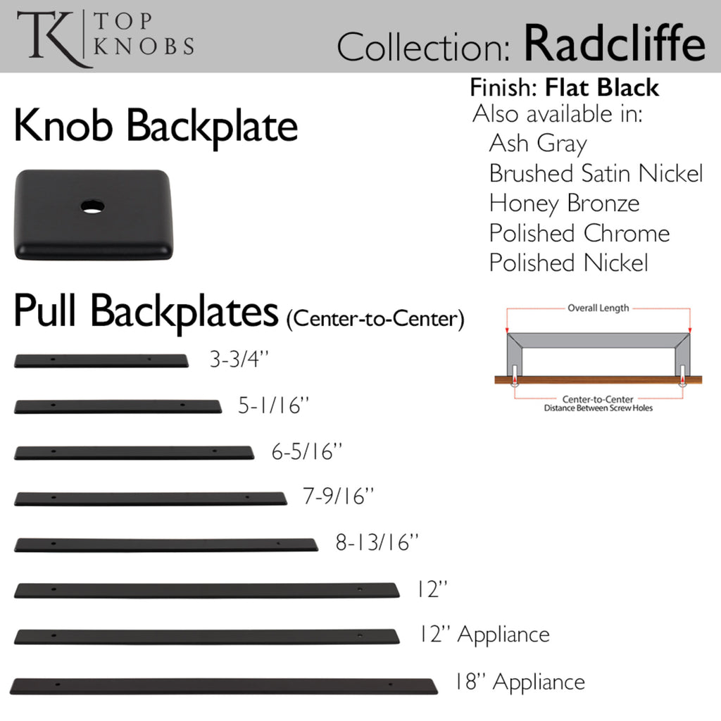 The universal style of the Radcliffe backplate suite allows for mixing and matching to create a seamless and polished look for any project. Conceal any existing marks or holes on your cabinet surface with ease using this backplate from the Radcliffe collection from Top Knobs. The universal style allows for mixing and matching to create a seamless and polished look for any project. From kitchens and bathrooms to laundry rooms and home offices, Top Knobs decorative cabinet hardware continues to shape home design with a range of options. Top Knobs offers the most extensive line of premium cabinet hardware allowing the creative freedom to complete the perfect look. Leave the finishing touch to the brand designers trust!, The universal style of the Radcliffe backplate suite allows for mixing and matching to create a seamless and polished look for any project. Conceal any existing marks or holes on your cabinet surface with ease using this backplate from the Radcliffe collection from Top Knobs. The universal style allows for mixing and matching to create a seamless and polished look for any project. From kitchens and bathrooms to laundry rooms and home offices, Top Knobs decorative cabinet hardware continues to shape home design with a range of options. Top Knobs offers the most extensive line of premium cabinet hardware allowing the creative freedom to complete the perfect look. Leave the finishing touch to the brand designers trust!, Perfect for quickly upgrading your hardware., Individually wrapped to protect from damage., Perfect for quickly upgrading your hardware., Individually wrapped to protect from damage., Finishes that will withstand the rigors of daily use, Attachment hardware not included., Buy with confidence knowing Top Knobs offers a Lifetime Warranty, , , ,