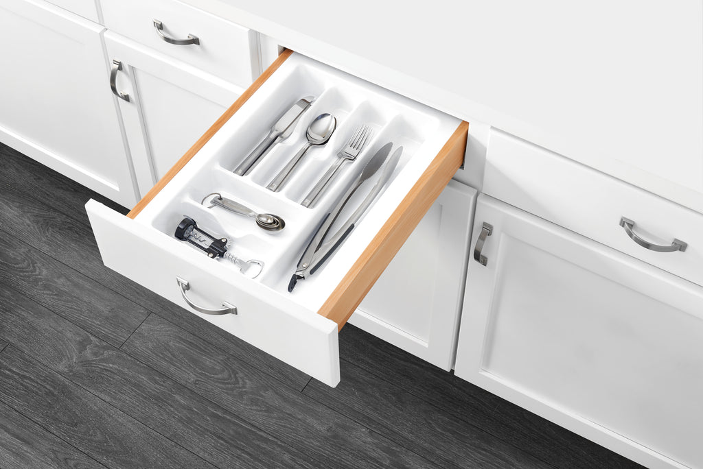 Rev-A-Shelf® Drawer Inserts are the best if you are looking for a custom look. Why settle for a cutlery insert that just drops in your drawer and moves every time you open and close your drawer? Create a custom fit by trimming to your exact size. Available in multiple sizes, colors and finishes.. Included: (1) Glossy White cutlery tray insert