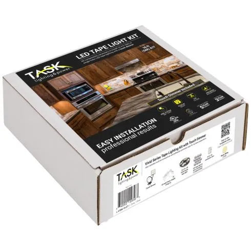 Everything needed to install 1 zone and 1 area of 16 ft of 12-Volt 225 Lumens/Ft Single-White LED Tape Lighting with a wired Touch Dimmer Switch in one box. Contains one 16 ft roll of 12-Volt 225 Lumens/Ft Single-White LED Tape Lighting with 3M Ultra Bond double-stick tape for peel-and-stick installation, 60W power supply, two 6-packs of 8 mm-EZ connectors, 25ft of wire, touch dimmer switch, two each male/female barrel-to-wire connectors screwdriver, and adhesive promoter wipe. Cut the tape light to length to achieve beautiful, even lighting in any space. IP65 Waterproof rated tape light. Field cut at 2" cut lines. On/off/dim functionality with included touch dimmer switch. Plug-in power supplies allow for installation without an electrician.
