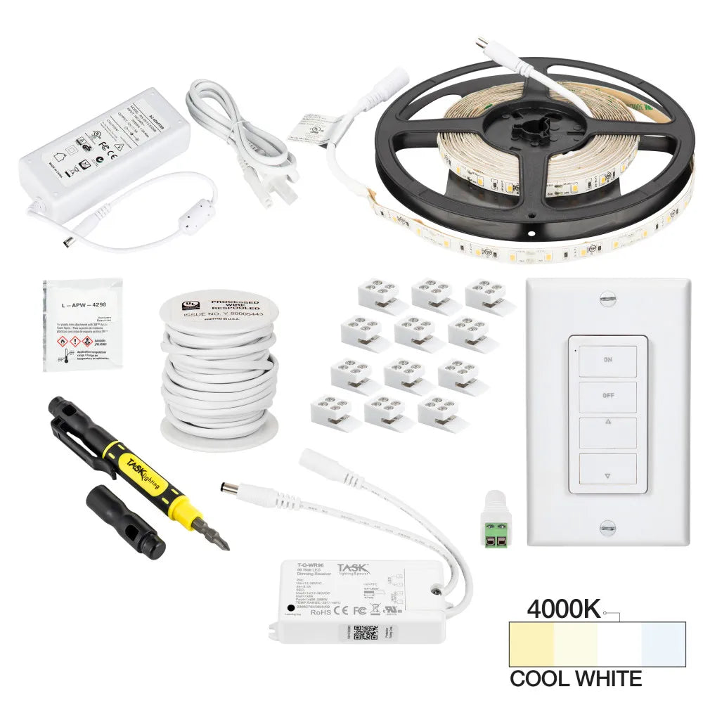 Everything needed to install 1 zone and 1 area of 16 ft of 12-Volt 120 Lumens/Ft Single-White LED Tape Lighting with a one-zone wireless controller in one box. Contains one 16 ft roll of 12-Volt 120 Lumens/Ft Single-White LED Tape Lighting, two 6-packs of 8 mm EZ Connectors, one plug-in 24W power supply, 25 ft connection wire, one-zone wireless controller, one wireless receiver, screwdriver, adhesive promoter wipe. Cut the tape light to length to achieve beautiful, even lighting in any space. Easily expand with expansion packs, sold separately. IP65 Waterproof rated tape light. Field cut at 2" cut lines. On/off/dim functionality with included touch dimmer switch. Plug-in power supplies allow for installation without an electrician.