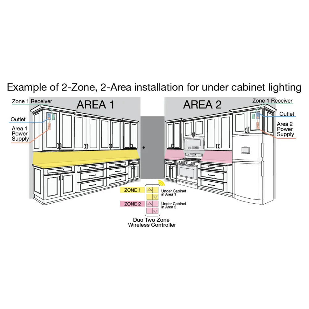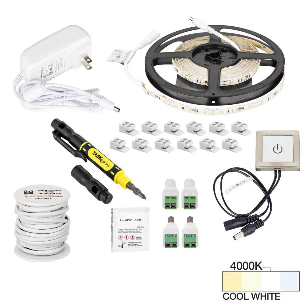Everything needed to install 1 zone and 1 area of 16 ft of 12-Volt 120 Lumens/Ft Single-White LED Tape Lighting with a wired Touch Dimmer Switch in one box. Contains one 16 ft roll of 12-Volt 120 Lumens/Ft Single-White LED Tape Lighting with 3M Ultra Bond double-stick tape for peel-and-stick installation, 24W power supply, two 6-packs of 8 mm-EZ connectors, 25ft of wire, touch dimmer switch, two each male/female barrel-to-wire connectors screwdriver, and adhesive promoter wipe. Cut the tape light to length to achieve beautiful, even lighting in any space. IP65 Waterproof rated tape light. Field cut at 2" cut lines. On/off/dim functionality with included touch dimmer switch. Plug-in power supplies allow for installation without an electrician.