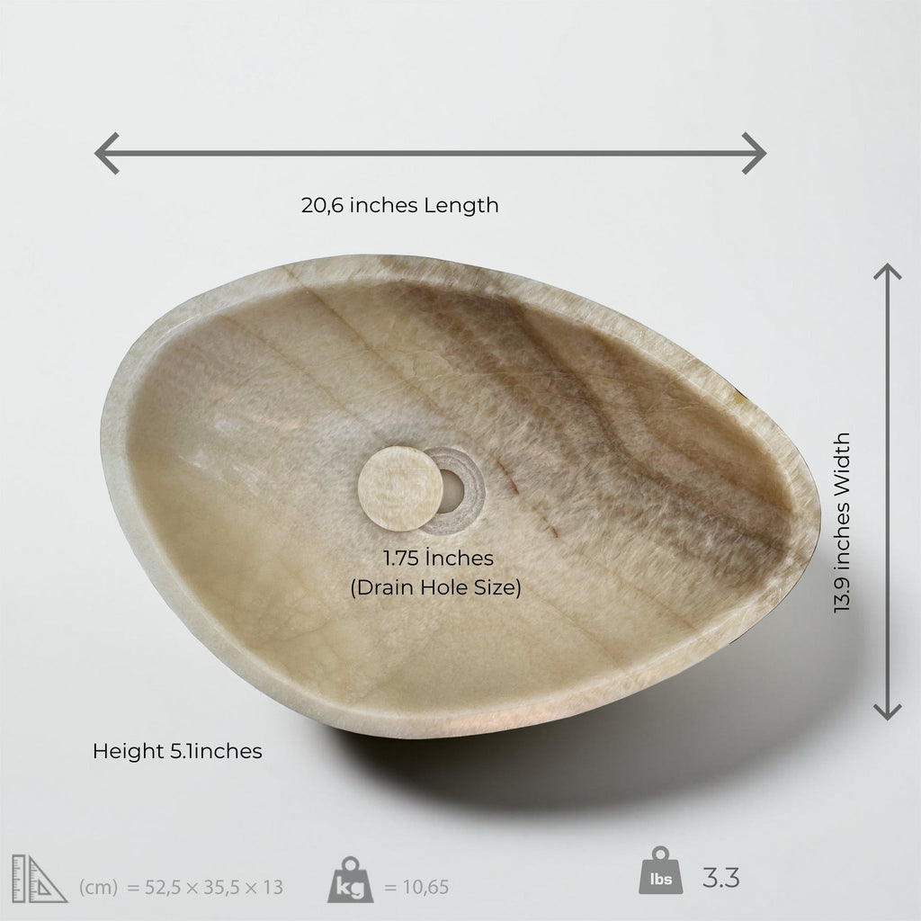 Standard Drain Hole Size – 4.5 cm (1.75") to fit most standard plumbing systems• 100% Natural Honey Onyx – Handcrafted from solid onyx; each sink is completely unique