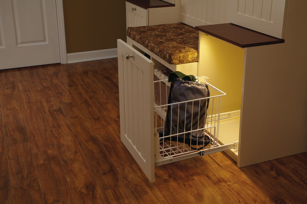 Another option for storing dirty clothes. The Pullout Wire Hamper is available in four sizes and is easily removable for carrying to the laundry room. The HRV Series features full-extension slides and easy installation with just four screws.. Included: (1) White wire hamper with metal frame and mounting hardware