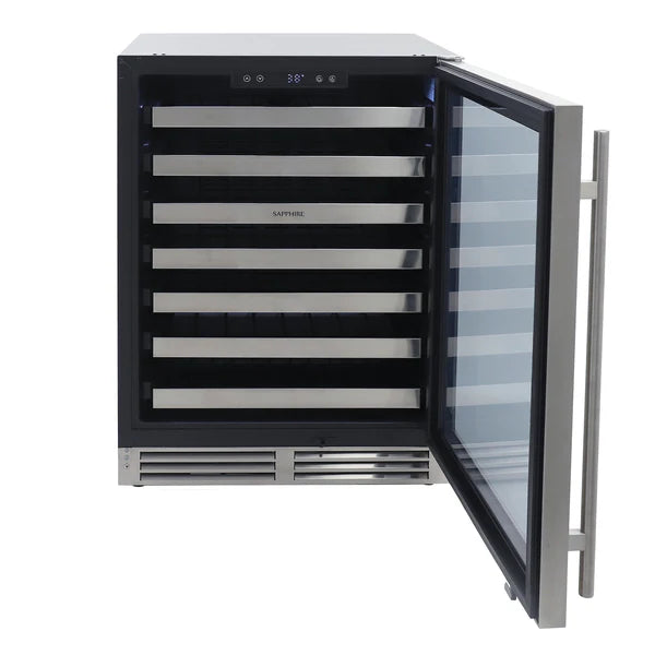 Protect and showcase your wine collection with the Sapphire 24" Series 3 ADA Undercounter Single Zone Wine Cooler. Designed for the collector with premium taste, this wine cooler offers 54 bottle storage capacity to store and chill your wine bottles. Ideal for your kitchen, dining room or entertainment area, temperature settings range from 38°F to 65°F, allowing for ideal preservation of any collection. The dual-paned tempered glass door with UV coating shields your wine from harmful light. This stainless steel panel ready model comes equipped with stainless steel panel with stainless steel handle that is easily converted to a 3/4" custom door panel and handle. With its elegant black exterior and interior, this dual temperature wine cooler will complement any entertainment space inside or outdoors. This single zone wine fridge features zero clearance, hinges with door close assist. The easy-to-use electronic control system actively manages your refrigeration system, including lighting, door ajar alarm and temperature failure alerts. The fan-assisted cooling system allows for even temperatures, quicker cooldown times and added efficiency. Flush LED lighting can be set to display your collection for 4 or 6 hours. The adaptable racking system includes 6 stainless front, full-extension wine racks and 1 bottom half wine rack. Precise zero clearance design allows for unmatched integration into any built-in setting, making this wine cooler a beautiful addition to your home. Experience the perfect fit for your home wine collection with the Sapphire Series 3 Single Zone Wine Cooler. Covered by the Sapphire Two-Year Parts & On-Site Labor and Five-Year Compressor Parts Only Limited Warranty.