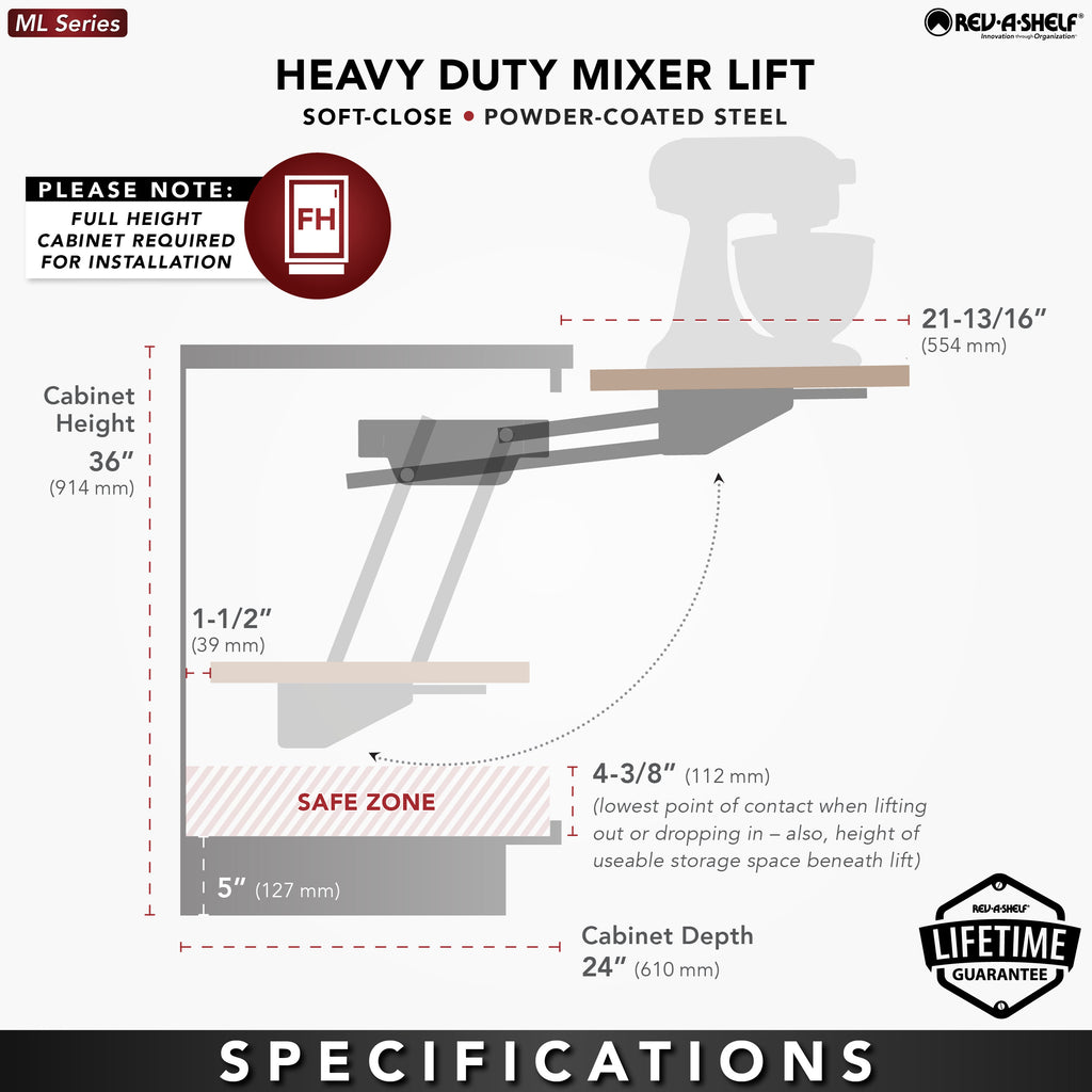 Rev-A-Shelf® has kept design and flexibility in mind with this heavy-duty appliance lift system. The lifting mechanism makes lifting a heavy or awkward appliance a breeze with its spring loaded supports and 3 different weight settings. The 1-1/2" thick wooden shelf is included and ready to install. Finally this unit features (2) built in dampeners that allow this unit to gently glide back inside of your cabinet with very little assistance needed.. Included: (1) Heavy-duty Lift (Assist) System and mounting hardware, (1) Walnut Shelf included